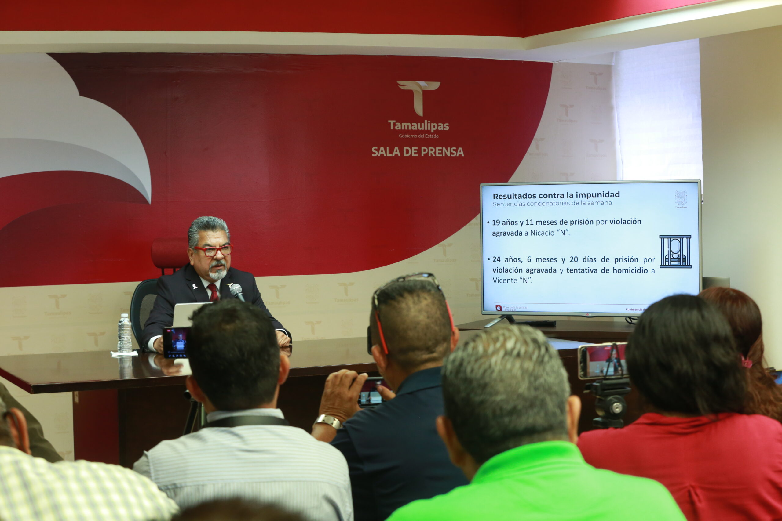 Durante la conferencia, el vocero de Seguridad dio a conocer una serie de sentencias condenatorias realizadas por la Fiscalía General de Justicia y la Fiscalía General de la República en esta semana como resultado del combate contra la impunidad.