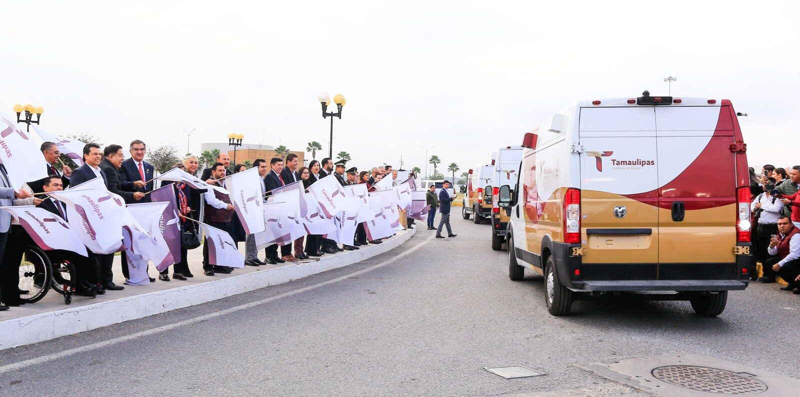 Al término de la ceremonia celebrada en el Polyforum de esta capital, el mandatario tamaulipeco, acompañado por integrantes del gabinete estatal, también hizo entrega de 10 patrullas para traslados en los Centros de Ejecución de Sanciones (Cedes) y dos ambulancias a la Coordinación Estatal de Protección Civil.