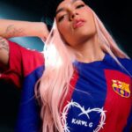 El club Barcelona confirmó en sus redes sociales que la cantante Karol G fue elegida por ser la artista femenina de música latina con más streams a nivel mundial durante 4 años consecutivos en la plataforma de Spotify.Además de la camiseta, se lanzarán sudaderas, bufandas, gorros y botellas de color rosa que tendrán el logotipo de la Bichota.