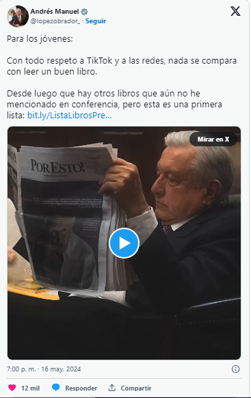 Por medio de su cuenta de X, el mandatario federal publicó una recopilación de fragmentos de video donde anteriormente hizo sus recomendaciones de libros y adelantó que habrá más en el futuro, pues dijo que esta lista es solo la primera de ellas.