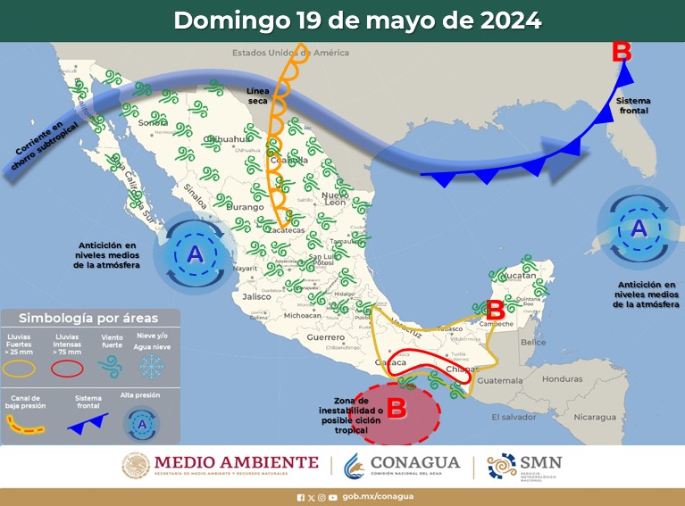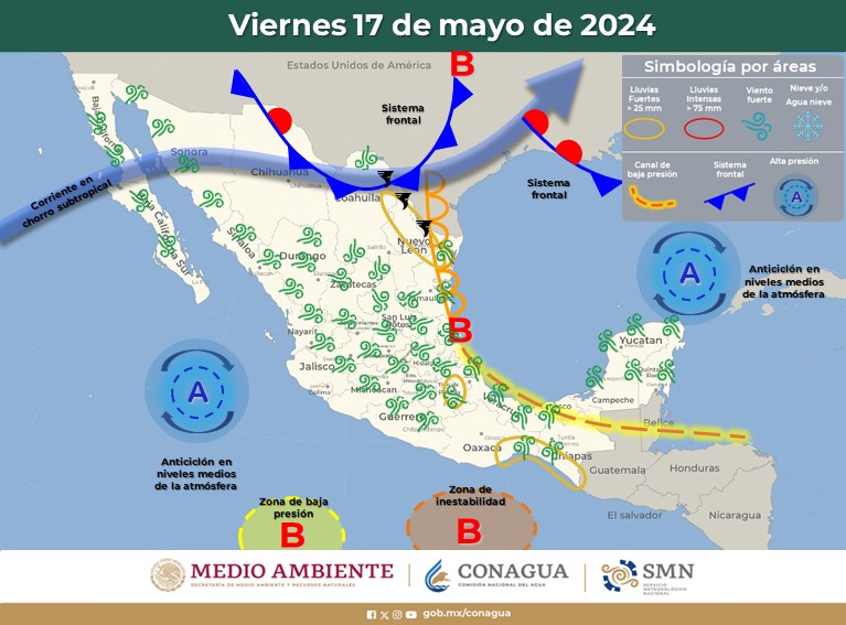 El frente frío (fuera de temporada) se extenderá con características de estacionario sobre el norte y noreste del país, interaccionando con la línea seca y con la corriente en chorro subtropical, por lo que se mantendrá la probabilidad de lluvias puntuales fuertes con descargas eléctricas y caída de granizo en Coahuila, Nuevo León y Tamaulipas, además de probabilidad de torbellinos o tornados en los estados mencionados.
