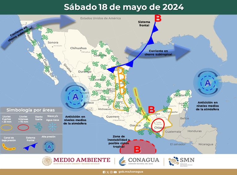 Un canal de baja presión sobre el oriente del país, en combinación con divergencia en altura, propiciarán lluvias y chubascos en el centro y oriente del país, así como rachas fuertes de viento, pronosticándose lluvias puntuales fuertes en los estados de Puebla, Veracruz, Ciudad de México, Estado de México y Tlaxcala, las lluvias mencionadas estarán acompañadas de descargas eléctricas y posible caída de granizo. Canal de baja presión en el sureste mexicano y el ingreso de humedad del Océano Pacífico, ocasionarán lluvias puntuales fuertes en Oaxaca y Chiapas.
