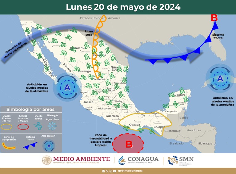 - Viento con rachas de 50 a 70 km/h con posibles tolvaneras: Baja California, Baja California Sur, Sonora, Chihuahua, Coahuila, Nuevo León, Tamaulipas, Durango y Aguascalientes.