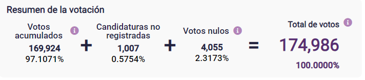 La tabla muestra el desglose de votos que cada candidatura presenta en el Municipio, indicando los votos recibidos de manera individual y, en su caso, los votos recibidos vía coalición.