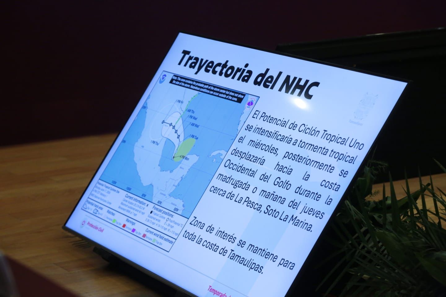 En la reunión, el meteorólogo de Protección Civil del Estado, Jesús Tovar Díaz, informó que, en la última actualización, por parte del Centro Nacional de Huracanes, el sistema presenta vientos de 65 kilómetros por hora, desplazándose a 11 kilómetros por hora al noroeste.