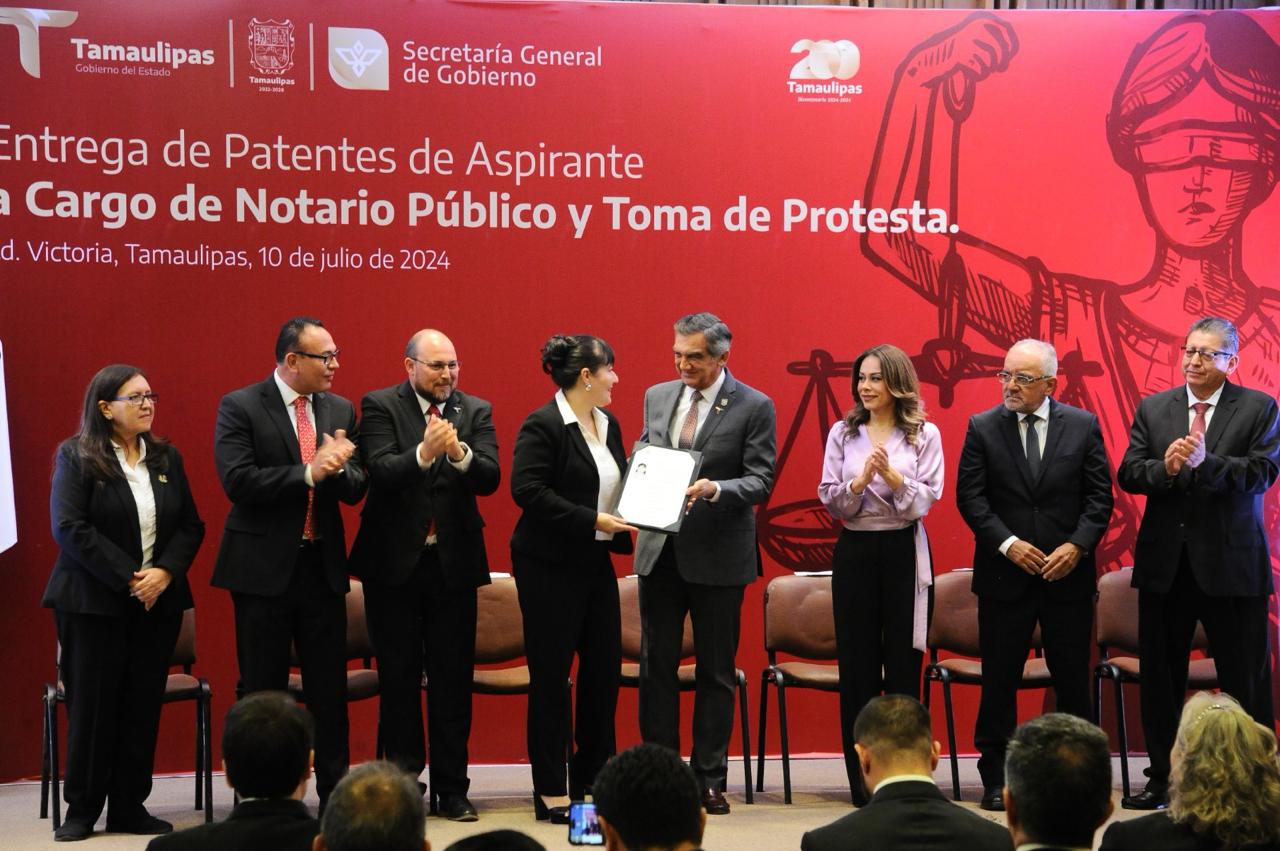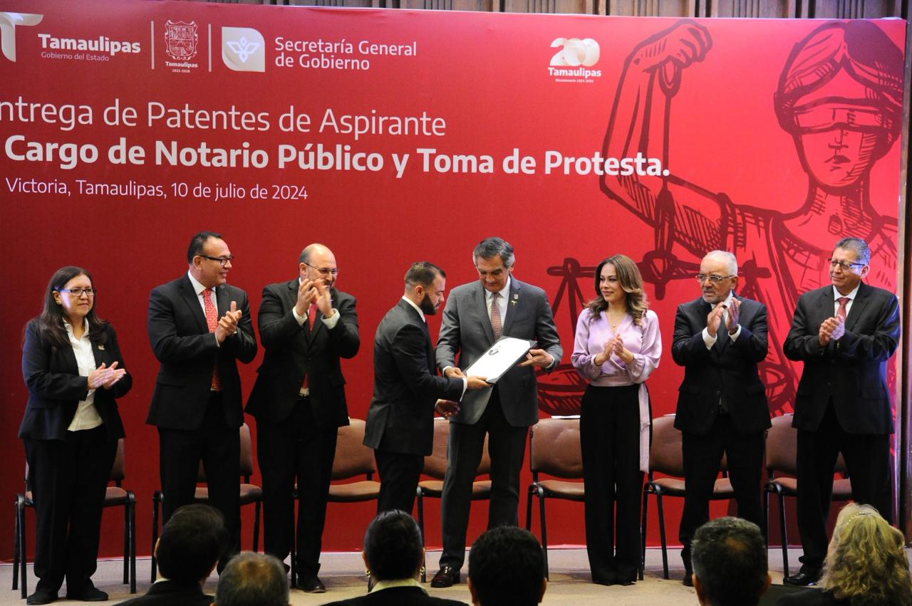 El gobernador Américo Villarreal Anaya presidió la ceremonia de entrega de patentes de aspirante a notario público y tomó la protesta a cinco abogados y abogadas que acreditaron los requisitos de la Ley del Notariado del Estado de Tamaulipas y aprobaron el examen correspondiente y anunció que está por abrirse la convocatoria para los nuevos fiats.