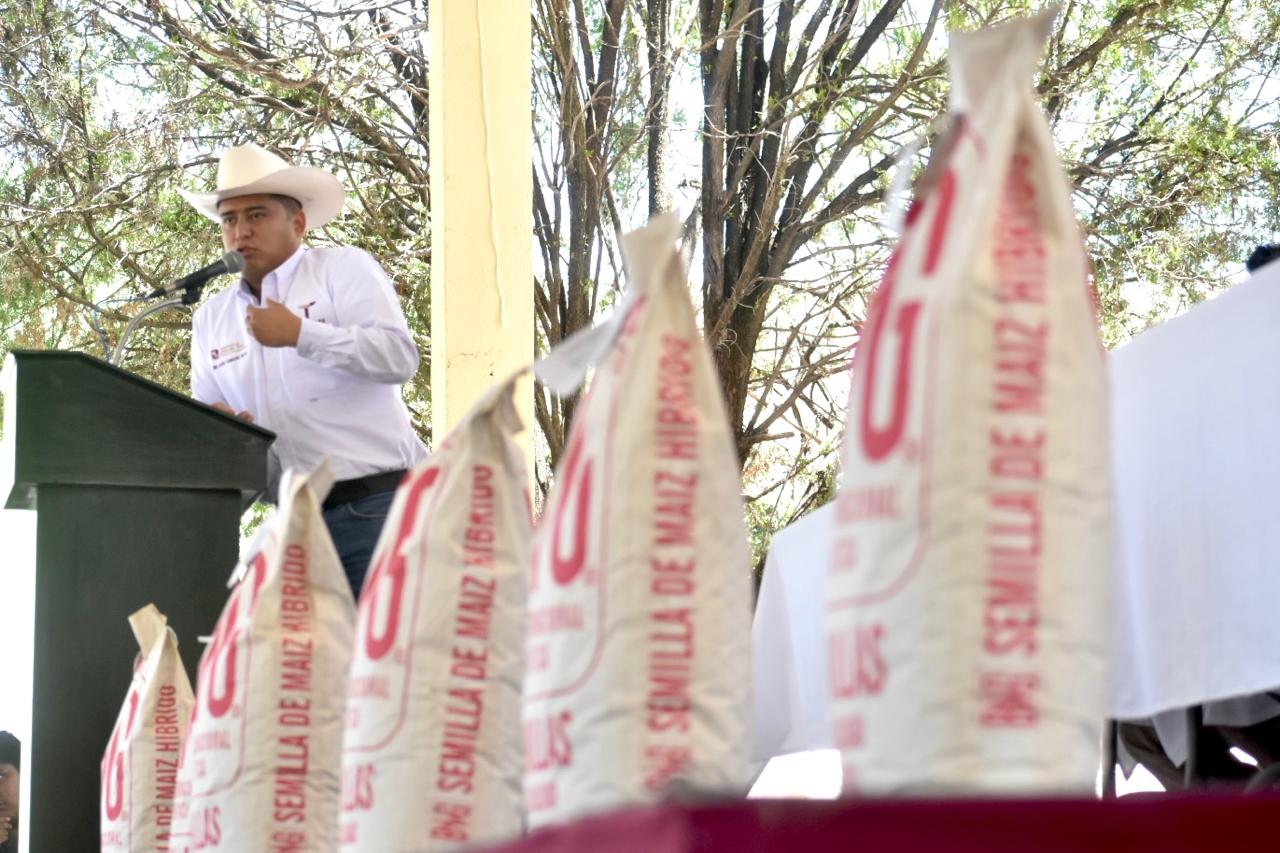 Con la firme intención de continuar apoyando a los productores del estado con programas y recursos que contribuyan al desarrollo sostenible del sector agropecuario, el Gobierno del Estado realizó la entrega de 2.72 toneladas de Semilla de Calidad de Maíz a productores rurales del municipio de Palmillas.