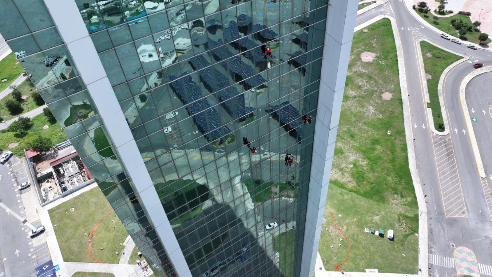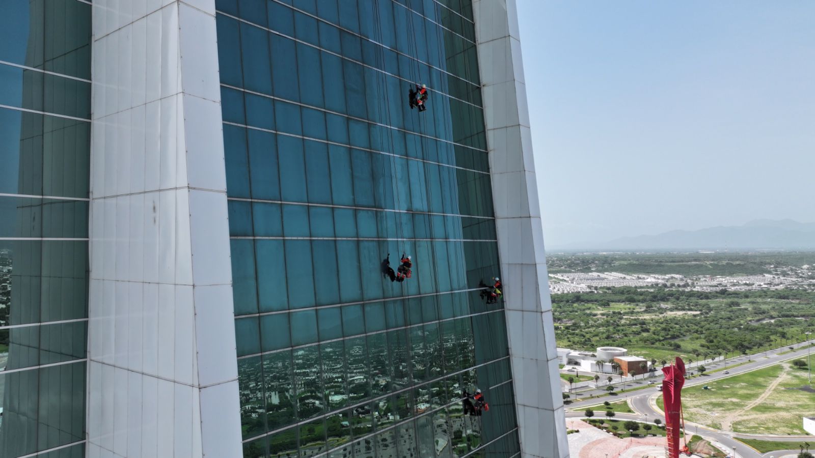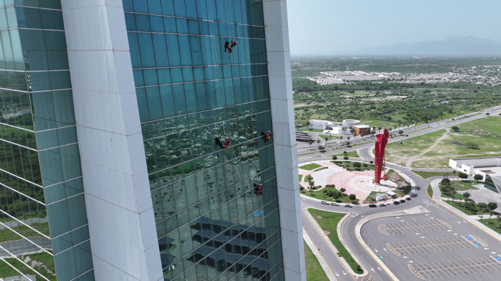 Las cuadrillas de trabajo, encabezadas por José Ángel Sevilla Morales, director general de Servicios, se encargan de hacer el cambio de láminas de la fachada de la Torre Bicentenario, con el fin de evitar daños en la estructura y mejorar la fachada principal del edificio. También se realiza el mantenimiento de los seis elevadores que dan servicio a los más de 2, 250 usuarios que diariamente asisten a esta torre gubernamental.