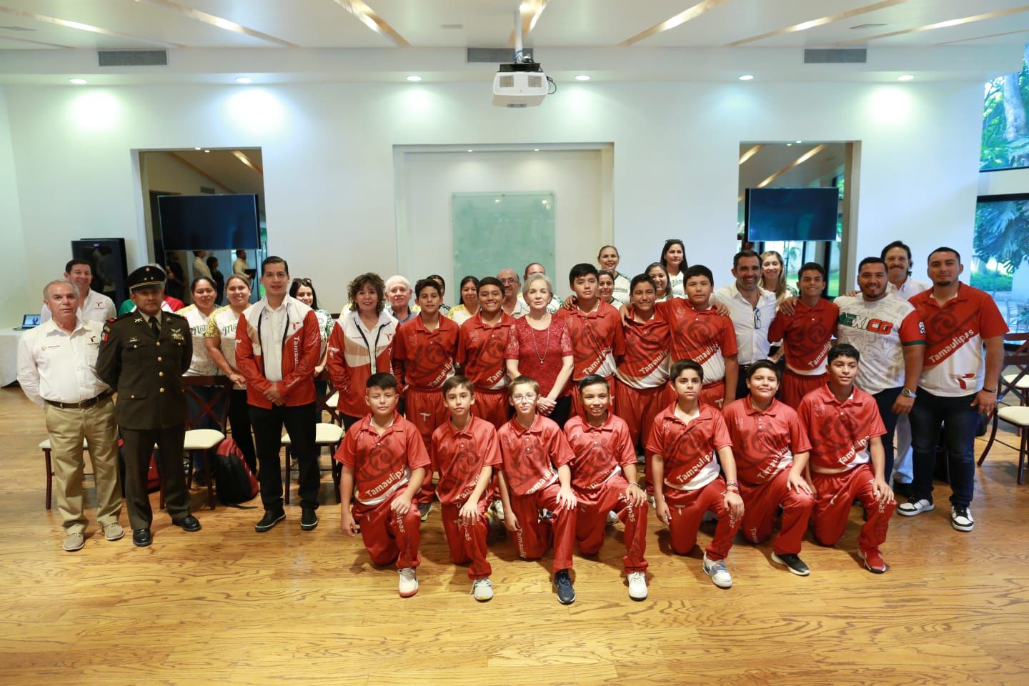 A nombre del gobernador Américo Villarreal Anaya, la presidenta del Sistema DIF Tamaulipas, María de Villarreal, abanderó y tomó la protesta al equipo de la Liga Matamoros A.C., que representará a México en el Campeonato Mundial de Ligas Pequeñas de Béisbol a celebrarse en Williamsport, Pensilvania.