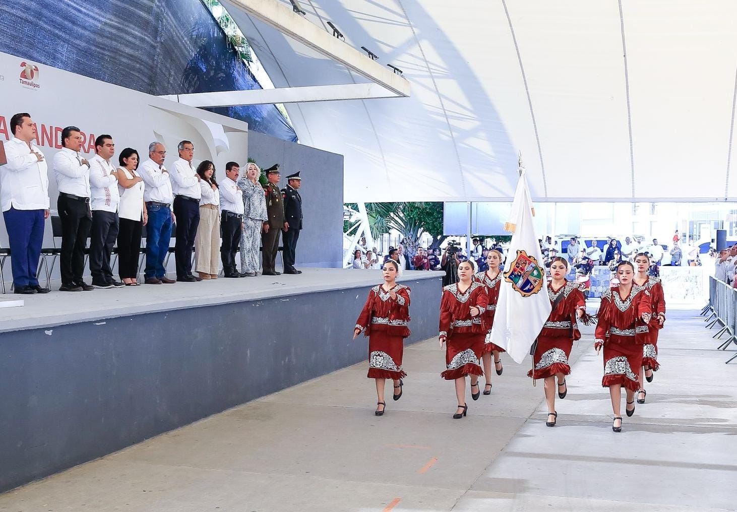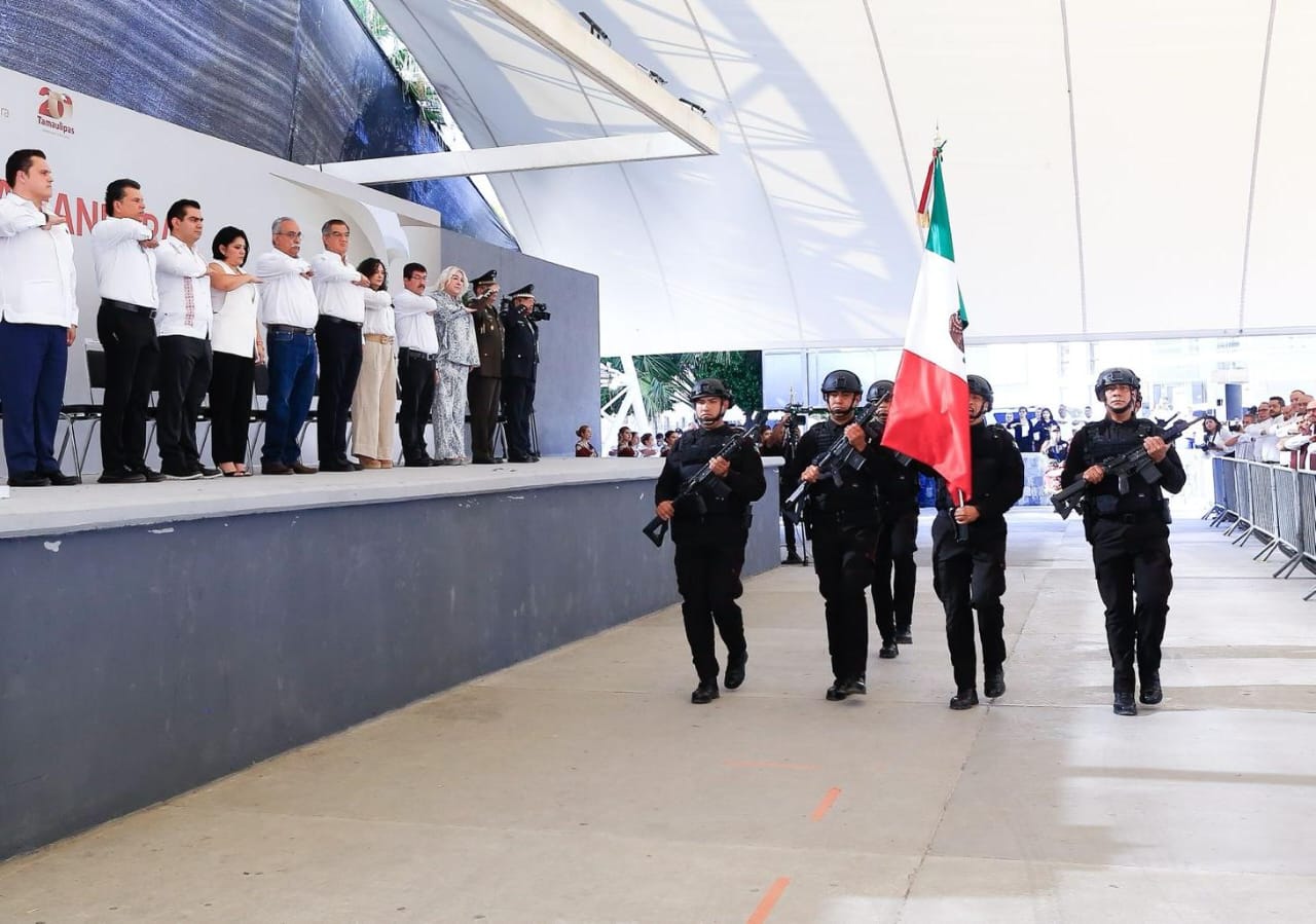 En esta ceremonia celebrada en el patinadero de la Unidad Deportiva Adolfo Ruiz Cortines, acompañaron al gobernador: la senadora electa, Olga Sosa Ruiz; el magistrado David Cerda Zúñiga, presidente del Supremo Tribunal de Justicia; la diputada Úrsula Salazar Mojica, presidenta de la Junta de Gobierno del Congreso del Estado; el diputado Humberto Prieto Herrera, presidente de la Diputación Permanente del Congreso; el rector de la Universidad Autónoma de Tamaulipas, Dámaso Anaya Alvarado; el presidente municipal de Victoria, Eduardo Gattás Báez; Adriana Lozano Rodríguez, secretaria de Finanzas; el general Julio César Islas Sánchez, comandante de la 48a Zona Militar; y, con la representación de la Guardia Nacional, el teniente Fernando Meneses Martínez.