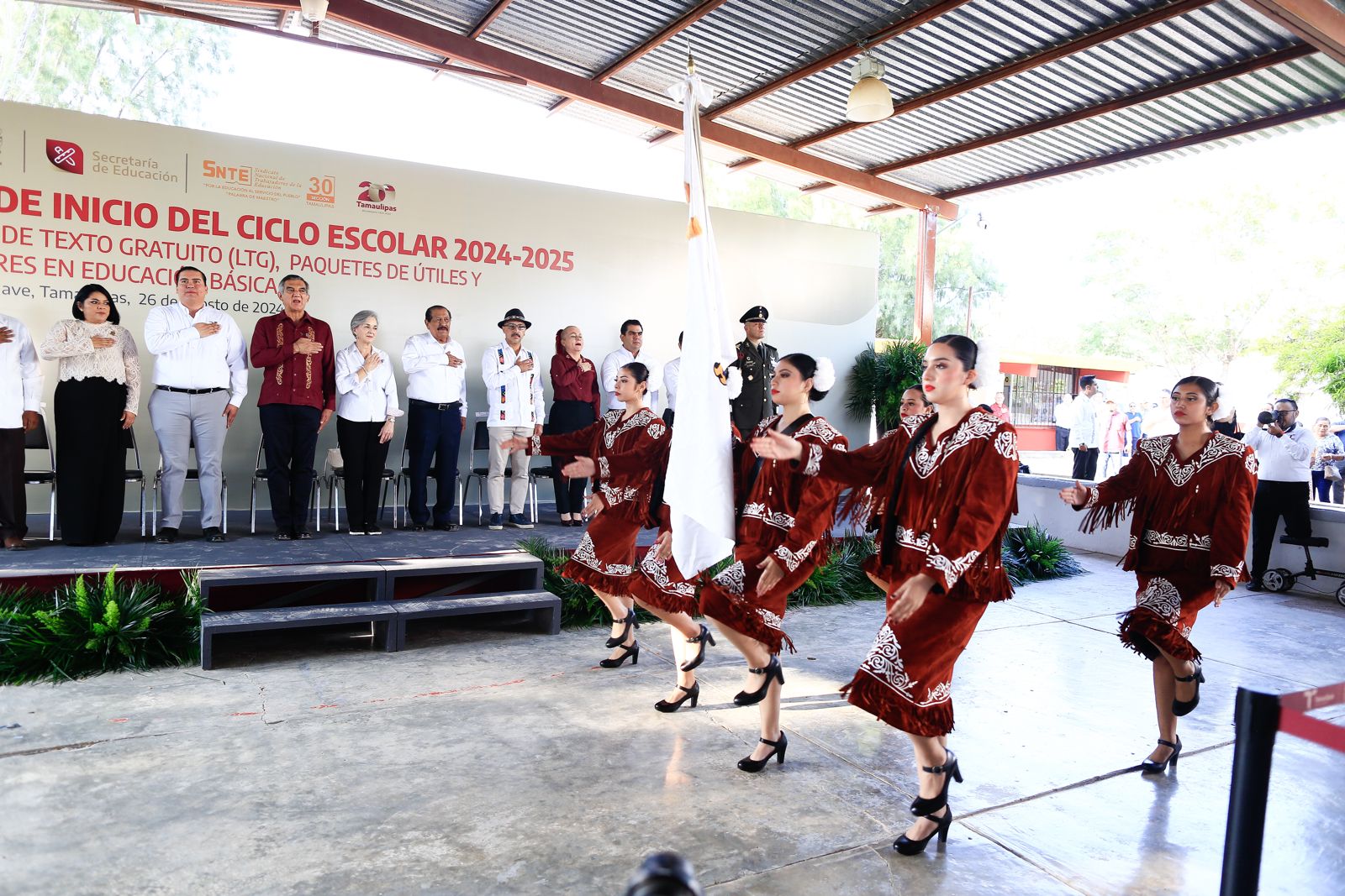 Durante la ceremonia cívica en la Escuela Primaria Francisco Zarco, del ejido San Antonio, municipio de Jaumave, y acompañado por la presidenta del DIF Tamaulipas, doctora María de Villarreal; el secretario general de la Sección 30 del SNTE, Arnulfo Rodríguez Treviño, y Rodrigo Castillo Aguilar, representante de la secretaria de Educación federal Leticia Ramírez Amaya, el gobernador entregó paquetes de útiles, uniformes y libros de texto gratuitos, ahí reiteró que su gobierno estará atento para mejorar las instalaciones educativas a través del ITIFE.