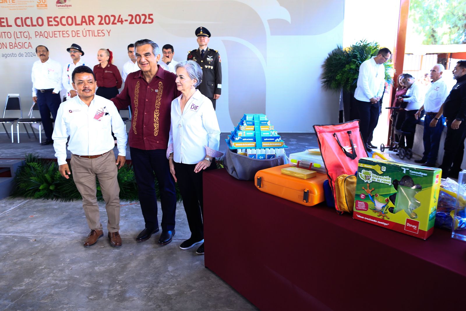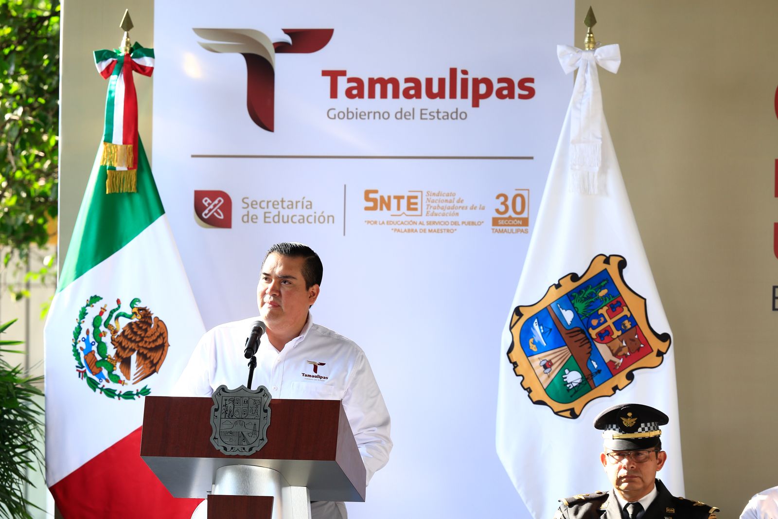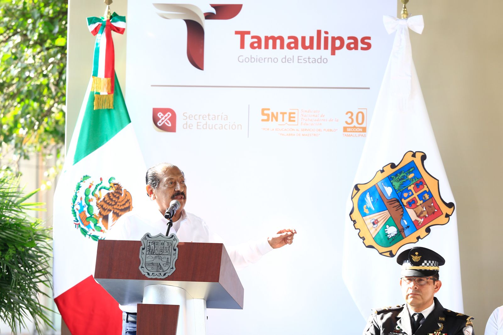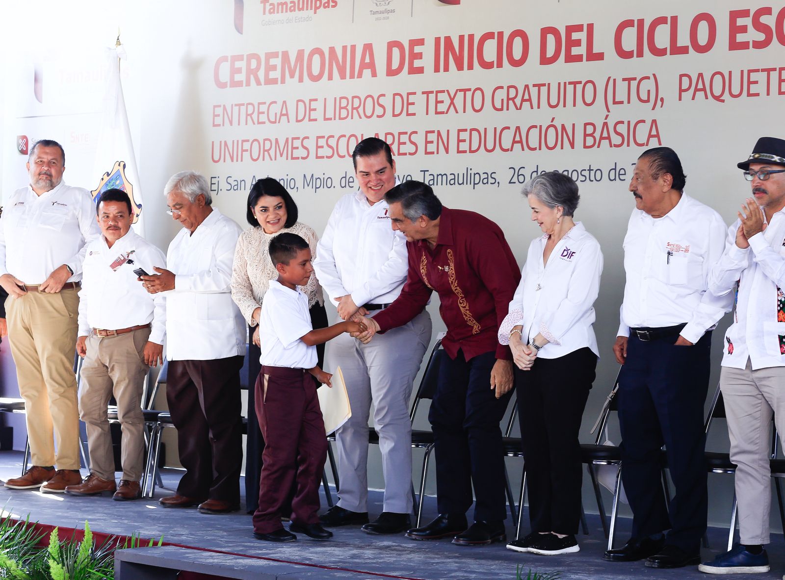 Durante la ceremonia cívica en la Escuela Primaria Francisco Zarco, del ejido San Antonio, municipio de Jaumave, y acompañado por la presidenta del DIF Tamaulipas, doctora María de Villarreal; el secretario general de la Sección 30 del SNTE, Arnulfo Rodríguez Treviño, y Rodrigo Castillo Aguilar, representante de la secretaria de Educación federal Leticia Ramírez Amaya, el gobernador entregó paquetes de útiles, uniformes y libros de texto gratuitos, ahí reiteró que su gobierno estará atento para mejorar las instalaciones educativas a través del ITIFE.