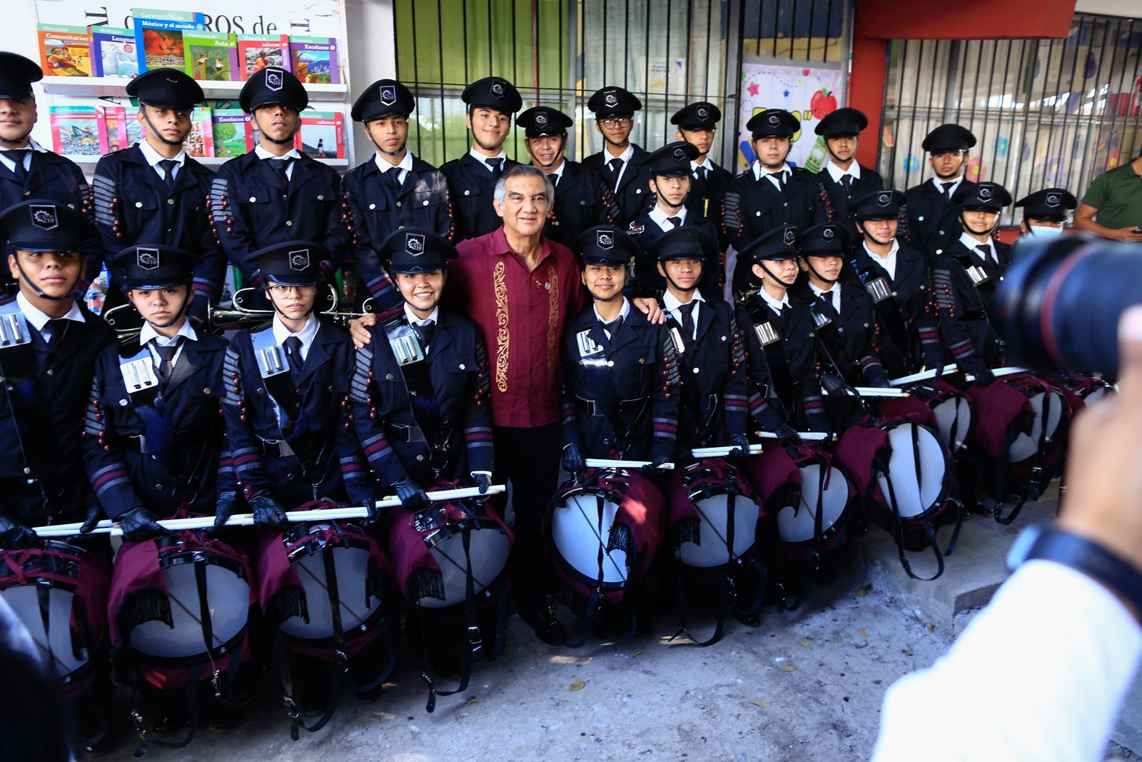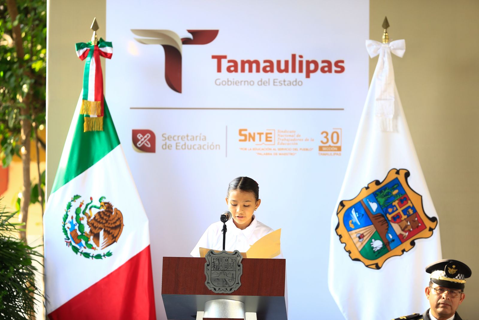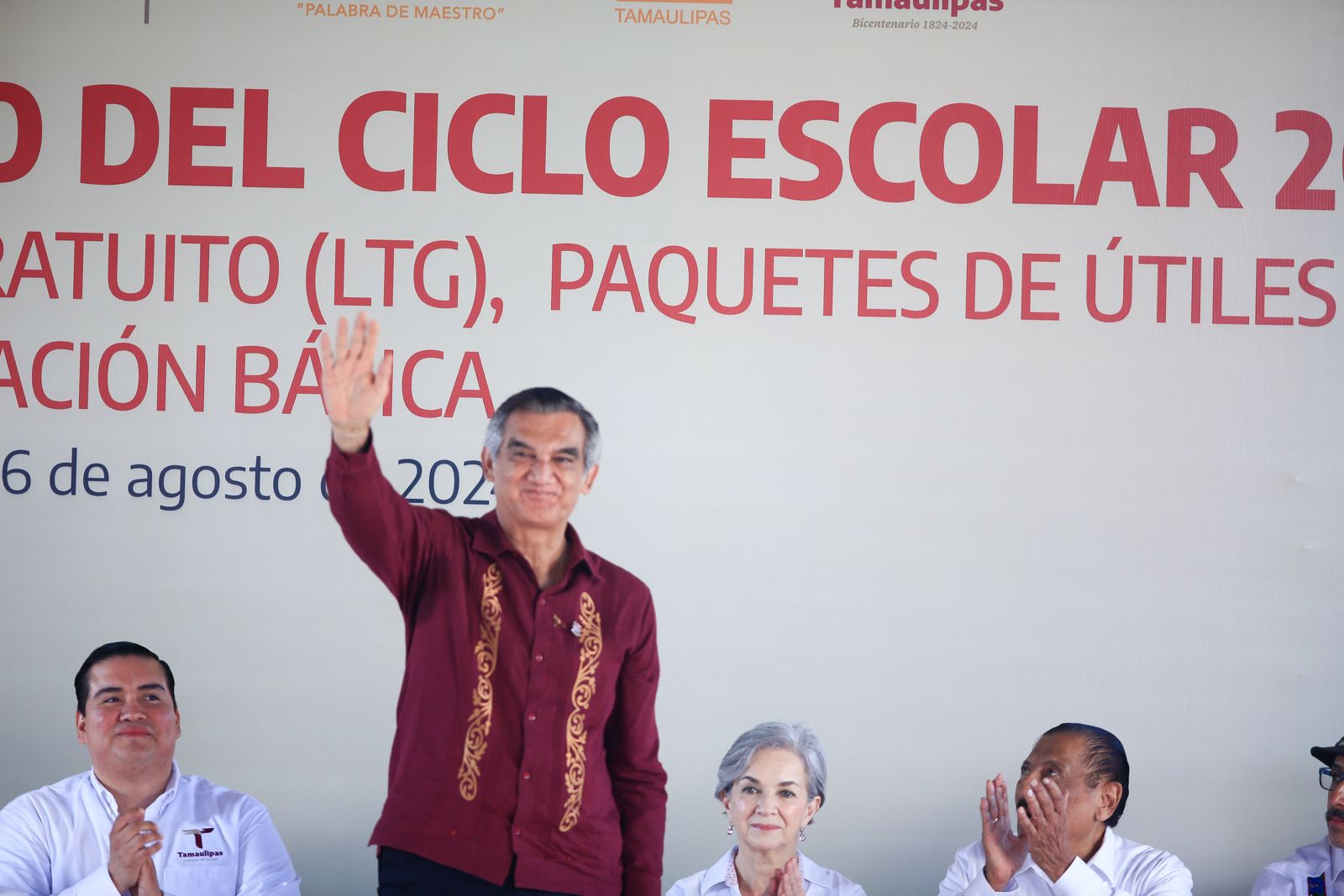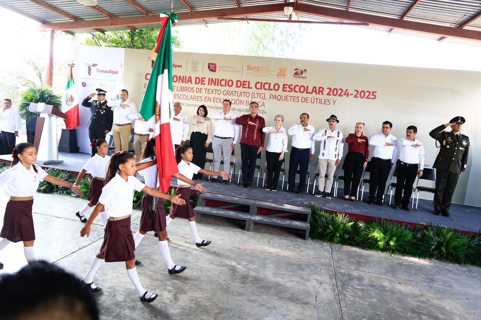 Durante la ceremonia cívica en la Escuela Primaria Francisco Zarco, del ejido San Antonio, municipio de Jaumave, y acompañado por la presidenta del DIF Tamaulipas, doctora María de Villarreal; el secretario general de la Sección 30 del SNTE, Arnulfo Rodríguez Treviño, y Rodrigo Castillo Aguilar, representante de la secretaria de Educación federal Leticia Ramírez Amaya, el gobernador entregó paquetes de útiles, uniformes y libros de texto gratuitos, ahí reiteró que su gobierno estará atento para mejorar las instalaciones educativas a través del ITIFE.