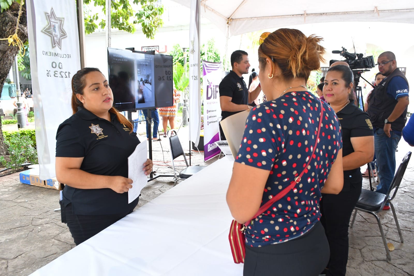 Teniendo como principio la equidad de género, personal del área de reclutamiento de la Secretaría de Seguridad Pública de Tamaulipas (SSPT) participó en la Feria “Empleo para Todas” celebrada en la Presidencia Municipal de Ciudad Victoria.