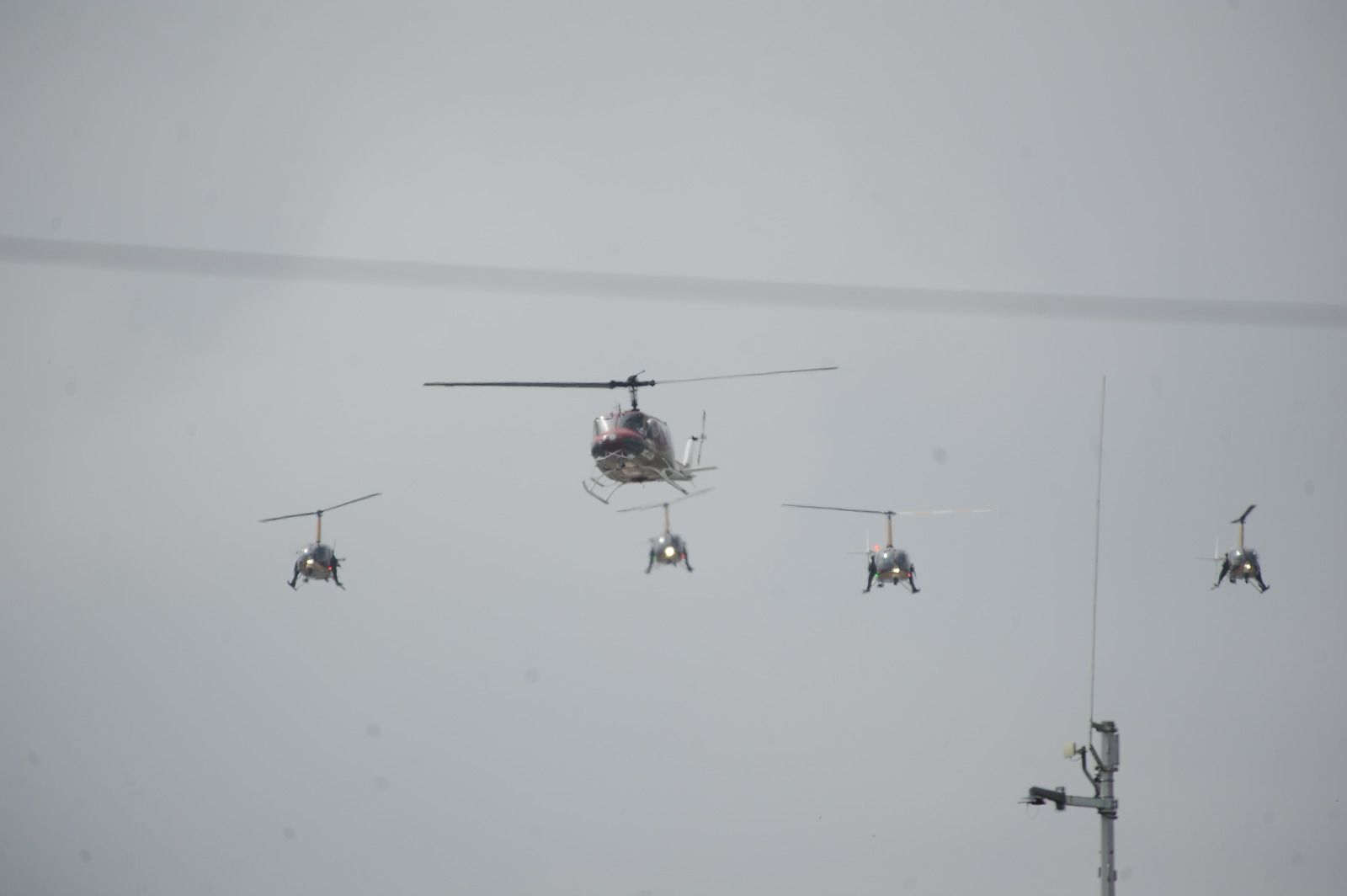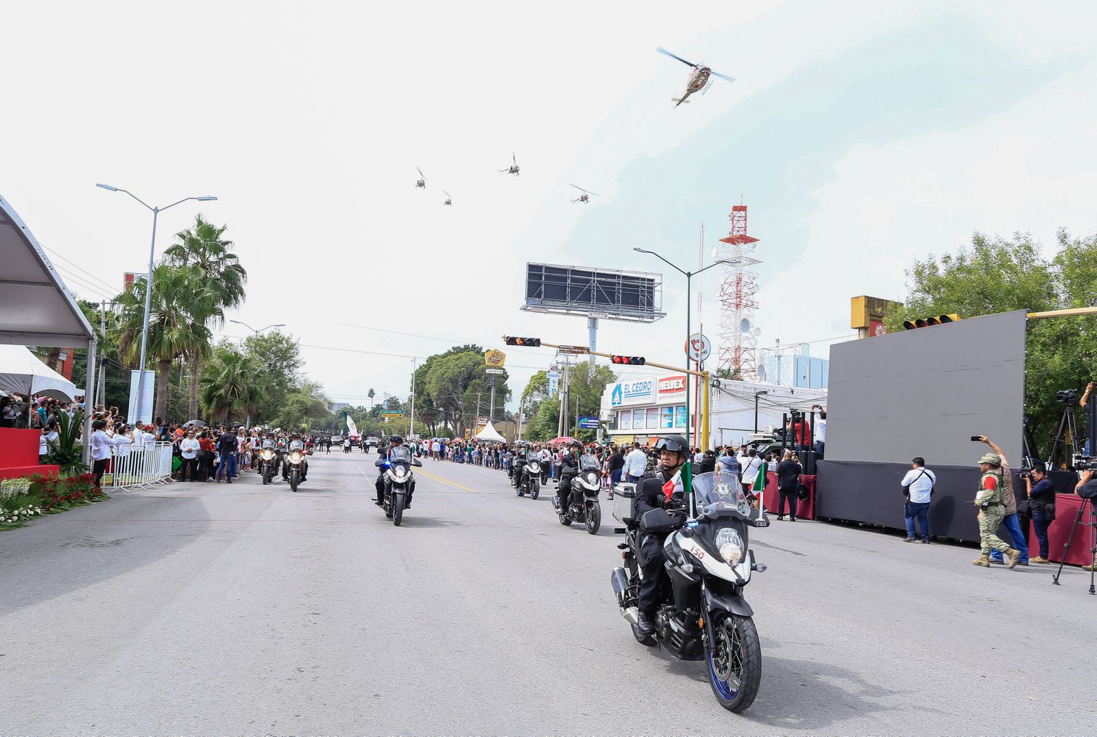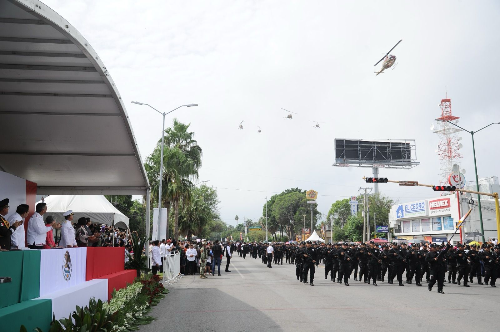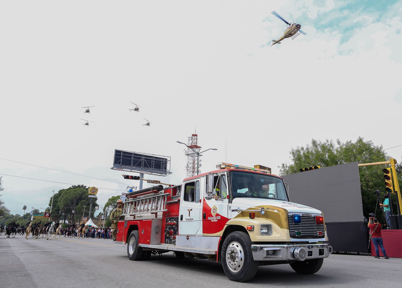 Uno de los momentos más aplaudidos por los asistentes fue cuando cinco helicópteros de la Secretaría de Seguridad Pública sobrevolaron el cielo victorense, uniéndose a ellos en un segundo vuelo un helicóptero de la Coordinación Estatal de Protección Civil.