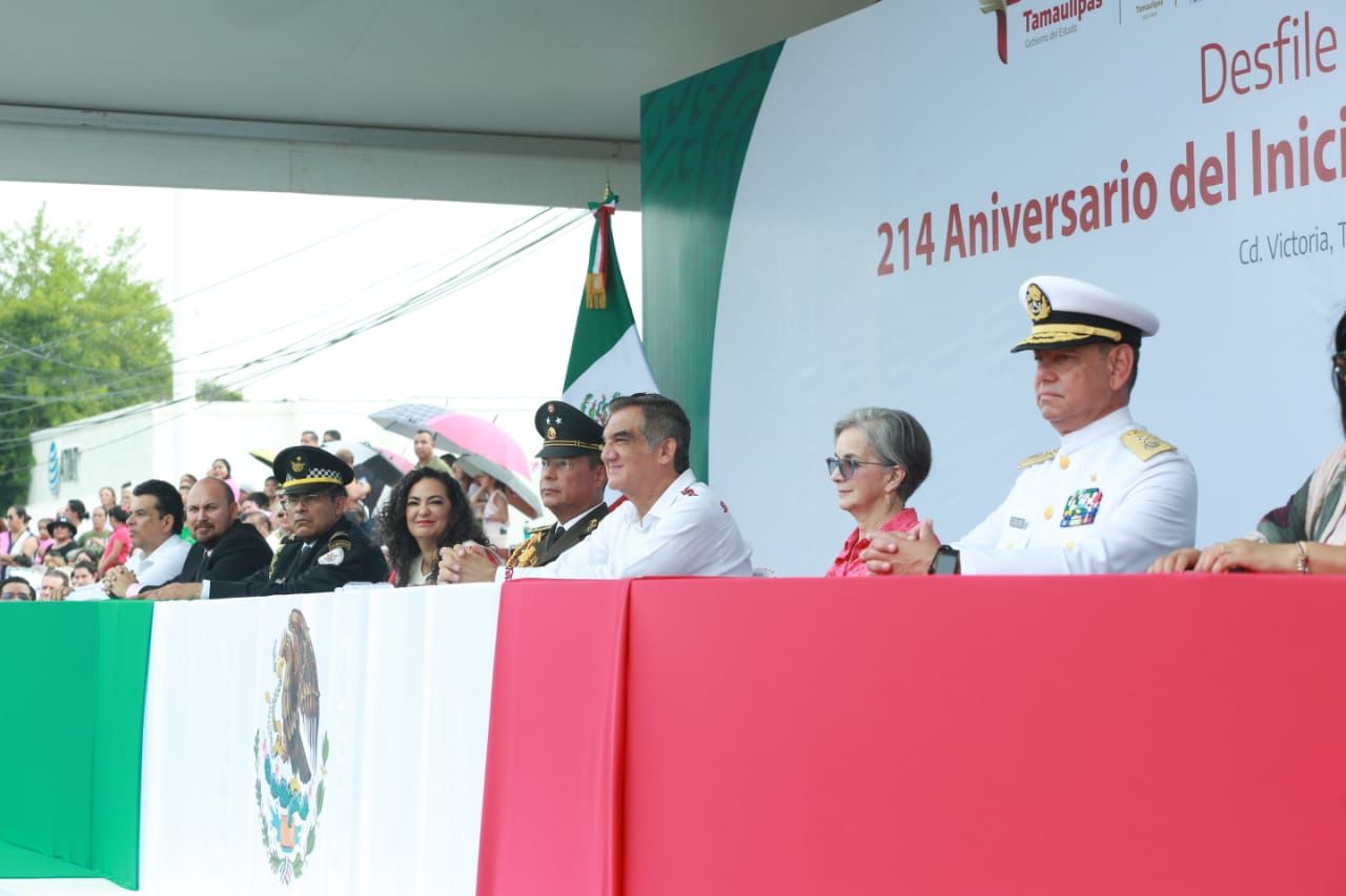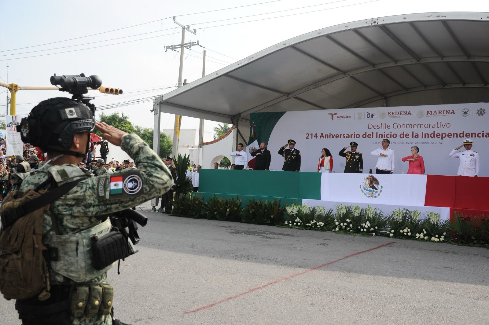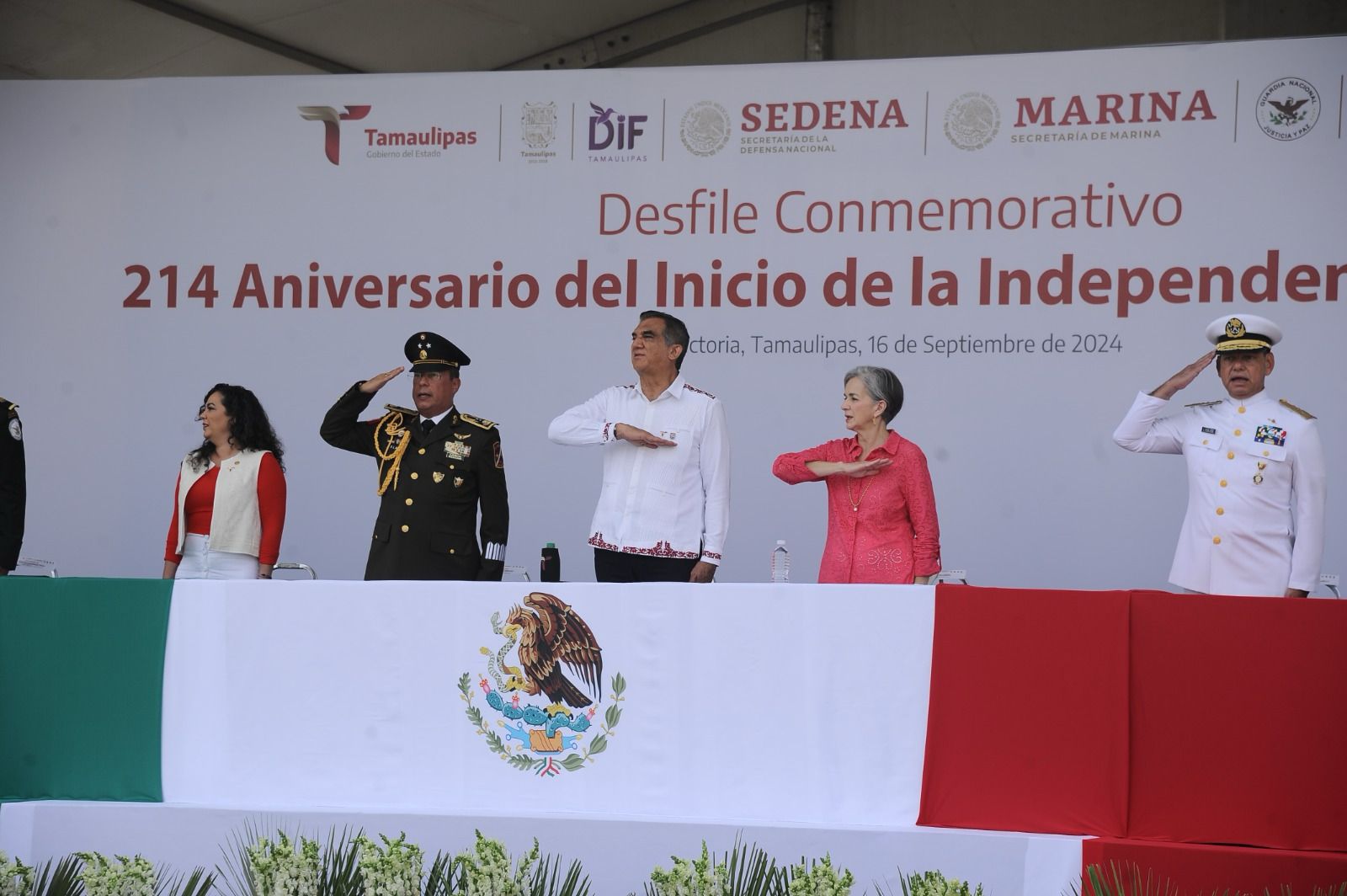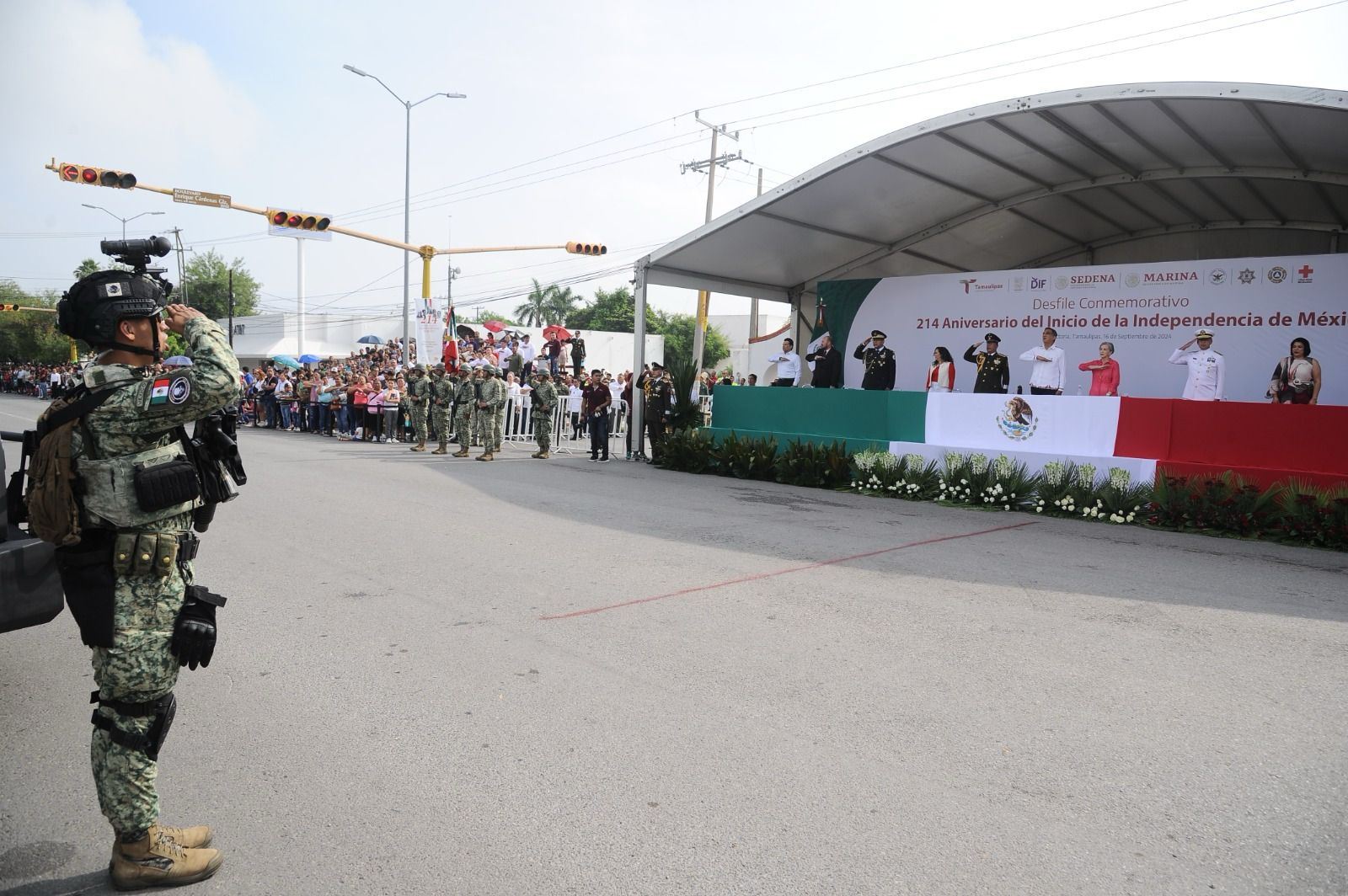 Como parte de las celebraciones por el 214 aniversario del inicio de la Independencia de México, el gobernador Américo Villarreal Anaya presidió el desfile cívico-militar, en el cual participaron 4,384 elementos de las Fuerzas Armadas, instituciones educativas y agrupaciones especiales, organizados en 39 contingentes.