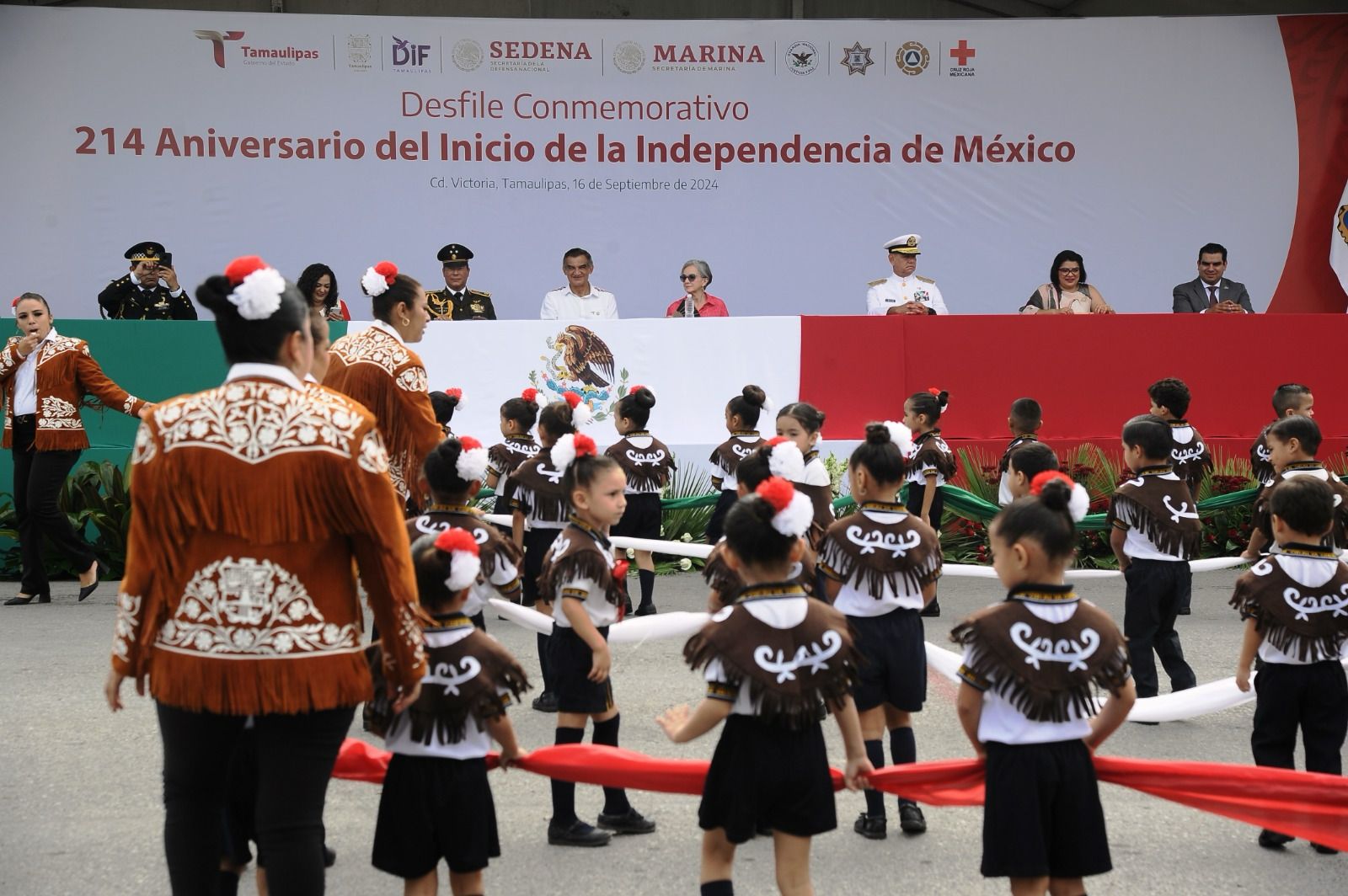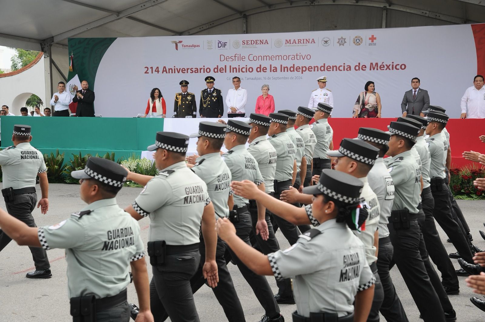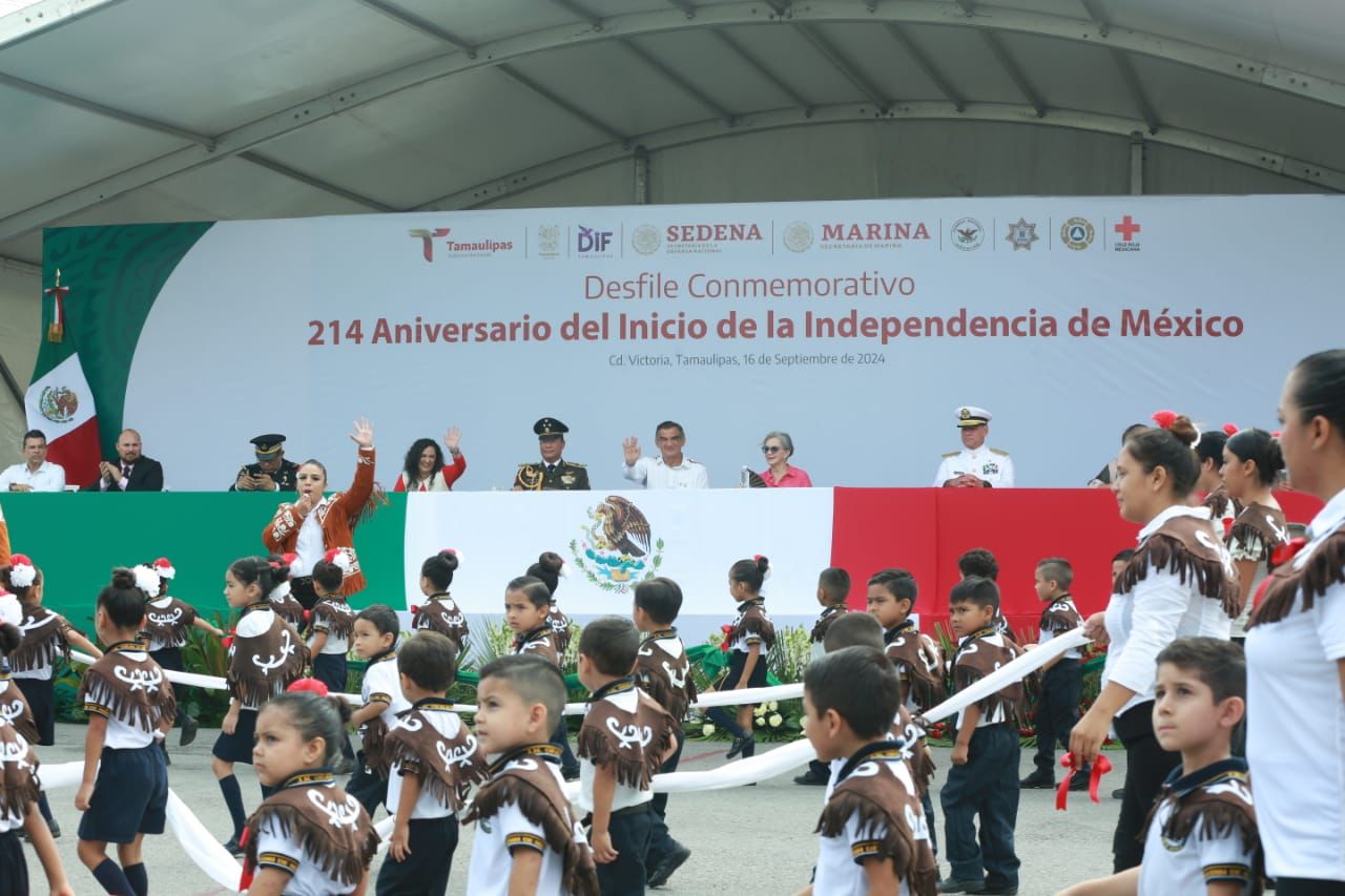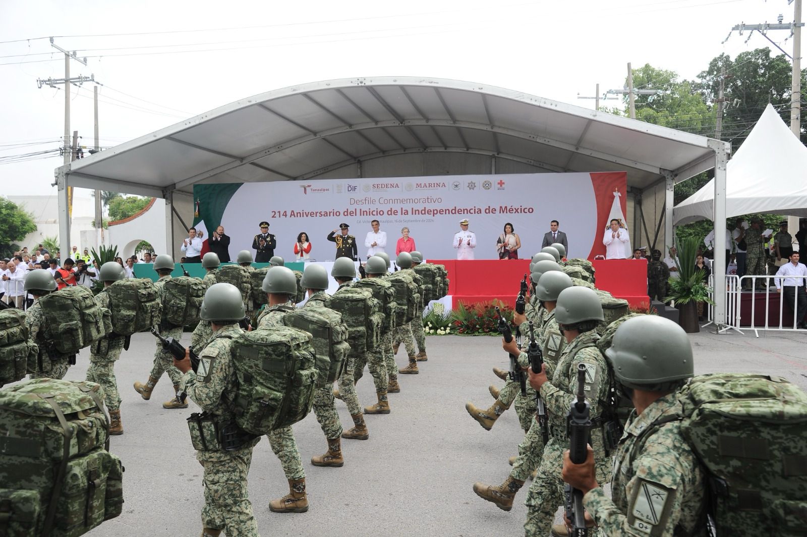 Como parte de las celebraciones por el 214 aniversario del inicio de la Independencia de México, el gobernador Américo Villarreal Anaya presidió el desfile cívico-militar, en el cual participaron 4,384 elementos de las Fuerzas Armadas, instituciones educativas y agrupaciones especiales, organizados en 39 contingentes.