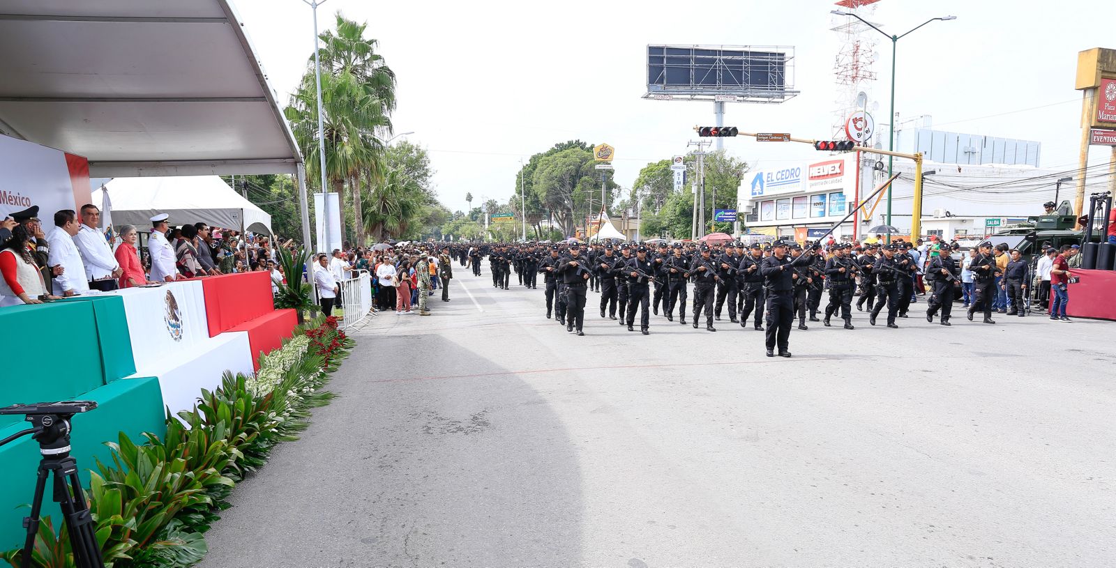 Acompañado por la presidenta del DIF Tamaulipas, María de Villarreal, así como por el general Julio César Islas Sánchez, comandante de la 48 Zona Militar, y el contralmirante Carlos Eduardo L’Eglise Escamilla, comandante de la Primera Región Naval, el gobernador presenció el paso de los contingentes a lo largo de la Avenida Tamaulipas, donde miles de familias tamaulipecas se congregaron.
