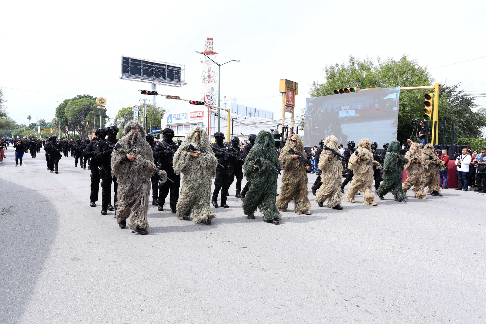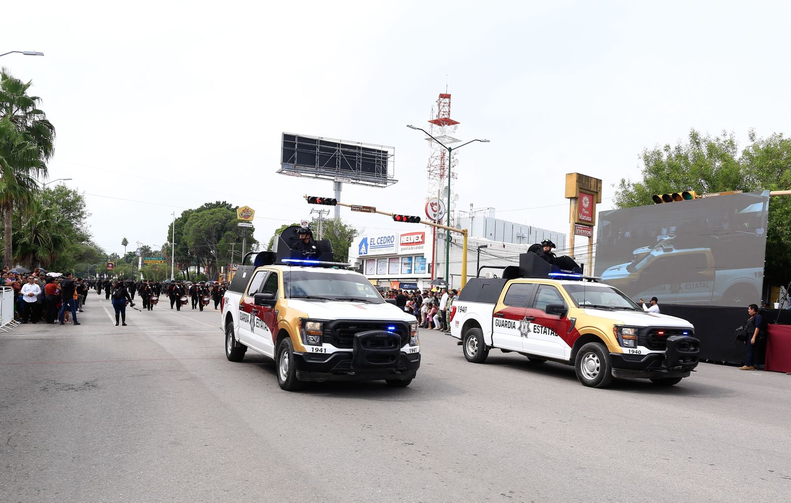 En el desfile también participaron 38 vehículos militares, 16 vehículos de la Guardia Nacional, 42 vehículos y cinco helicópteros de la Guardia Estatal, cuatro vehículos de Protección Civil y Bomberos, siete vehículos de la Cruz Roja, y 85 caballos pertenecientes a la Federación Mexicana de Cabalgantes, la Asociación de Charros Praxedis Baboa y la Unidad de Agrupamiento Montada de la Secretaría de Seguridad Pública, además de 34 perros entrenados.