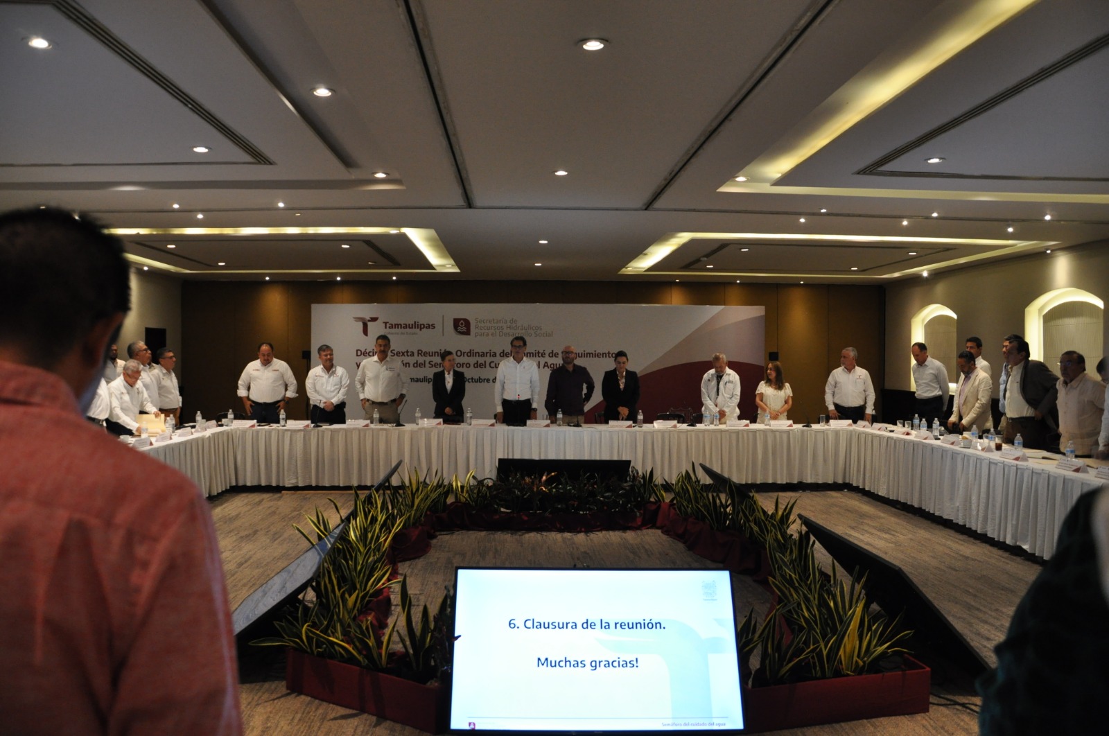 El secretario de Recursos Hidráulicos para el Desarrollo Social, Raúl Quiroga Álvarez, presidió la décima sexta Reunión Ordinaria del Comité de Seguimiento y Evaluación del Semáforo del Cuidado del Agua, acompañado por la secretaría de Economía, Ninfa Cantú Deándar, el representante de la Secretaría de Salud, presidenta y presidentes municipales, directivos del sector industrial y gerentes generales de los diferentes organismos operadores del agua.