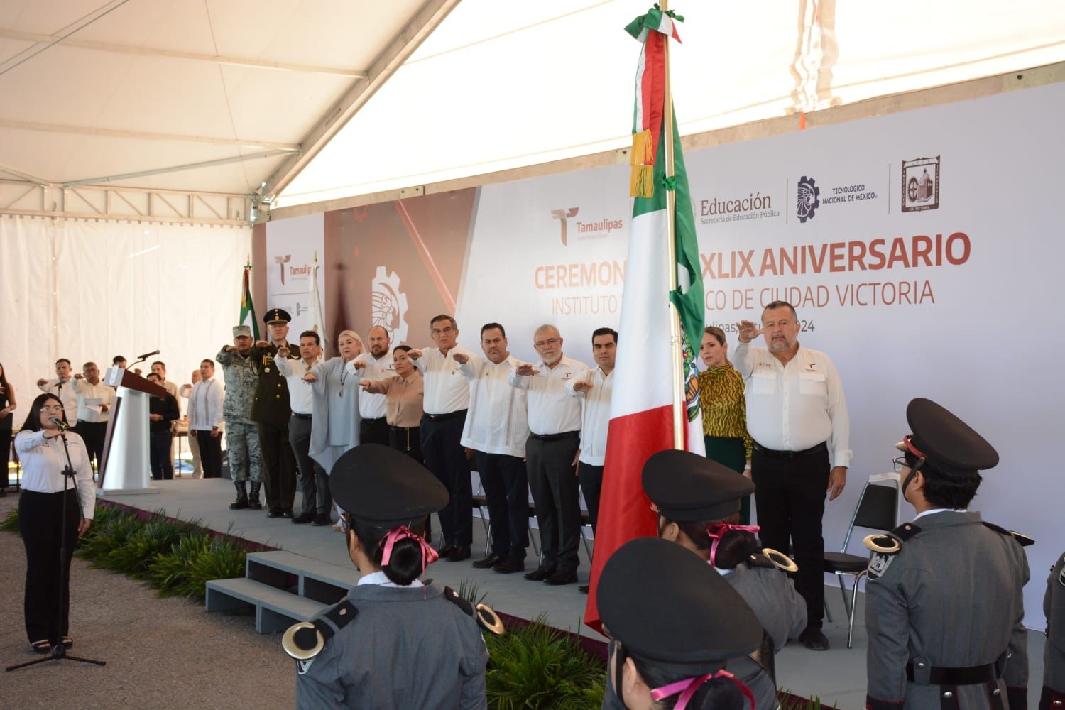 Acompañaron al gobernador en la ceremonia de honores: Héctor Joel Villegas González, secretario general de Gobierno; Adriana Lozano Rodríguez, secretaria de Finanzas; Carlos Elizondo Serrano, en representación de la 48a Zona Militar; el subinspector Jorge García Rodríguez, en representación de la Guardia Nacional; David Cerda Zúñiga, presidente del Supremo Tribunal de Justicia; la diputada Yuriria Iturbe Vázquez, presidenta de la Comisión de Educación del Congreso; Eduardo Gattás Báez, presidente municipal de Victoria, y el director general del ITIFE, Sergio Castillo Sagástegui.
