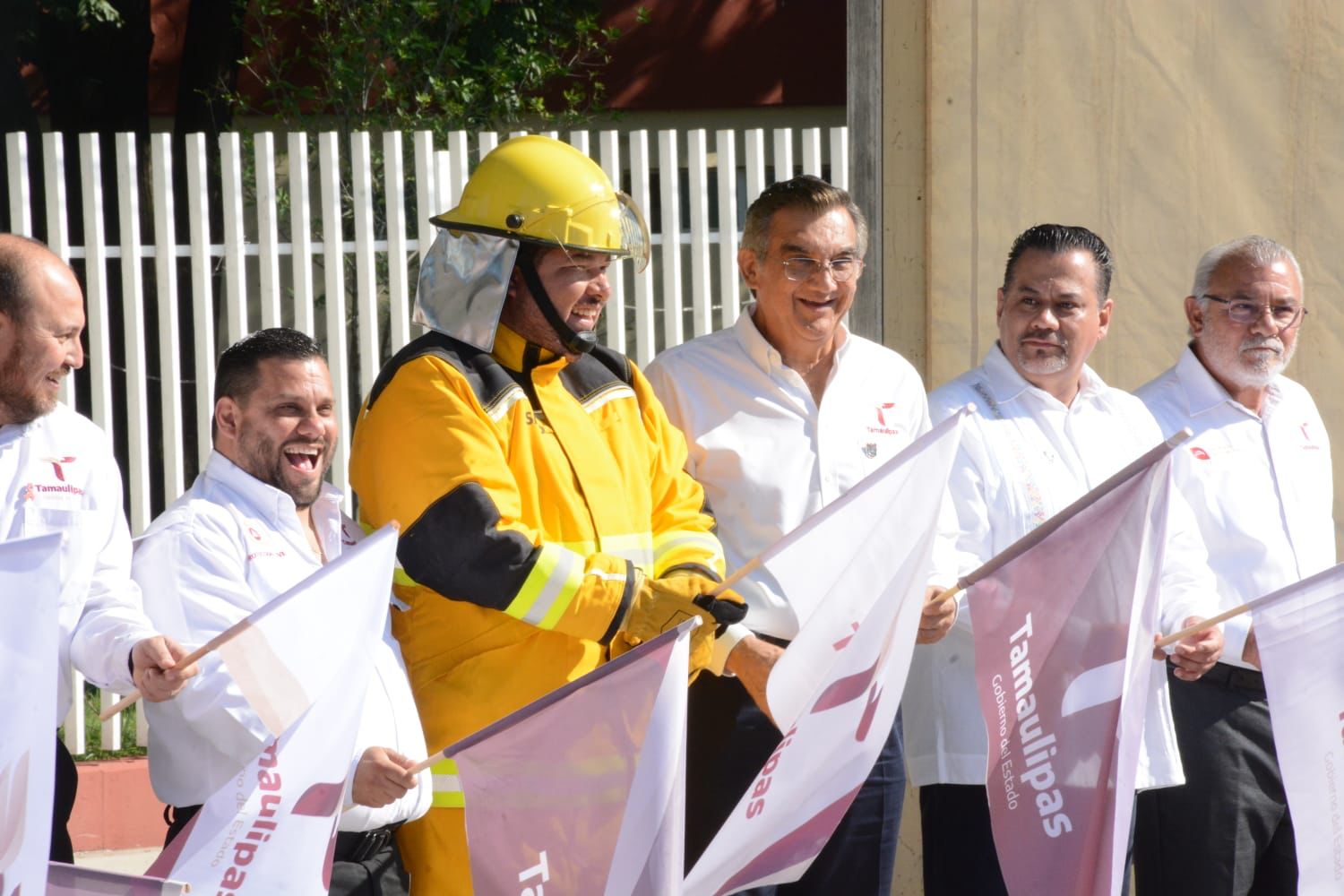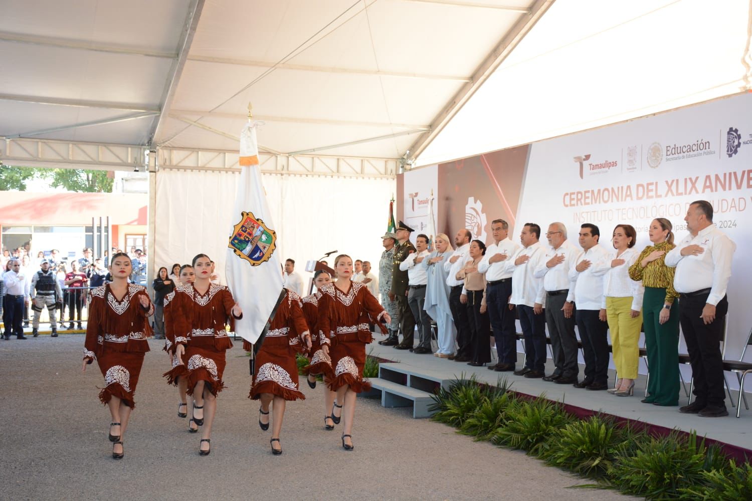 Acompañaron al gobernador en la ceremonia de honores: Héctor Joel Villegas González, secretario general de Gobierno; Adriana Lozano Rodríguez, secretaria de Finanzas; Carlos Elizondo Serrano, en representación de la 48a Zona Militar; el subinspector Jorge García Rodríguez, en representación de la Guardia Nacional; David Cerda Zúñiga, presidente del Supremo Tribunal de Justicia; la diputada Yuriria Iturbe Vázquez, presidenta de la Comisión de Educación del Congreso; Eduardo Gattás Báez, presidente municipal de Victoria, y el director general del ITIFE, Sergio Castillo Sagástegui.