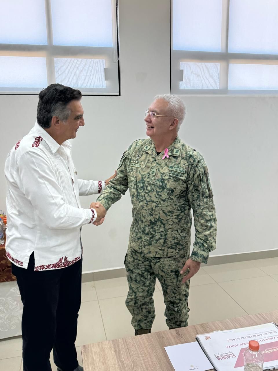 El gobernador Américo Villarreal Anaya sostuvo una reunión de trabajo con el general Ricardo Trevilla Trejo, secretario de la Defensa Nacional, a fin de evaluar el avance de la construcción de la Agencia Nacional de Aduanas de México, ANAM, que será inaugurada próximamente por la presidenta Claudia Sheinbaum Pardo.