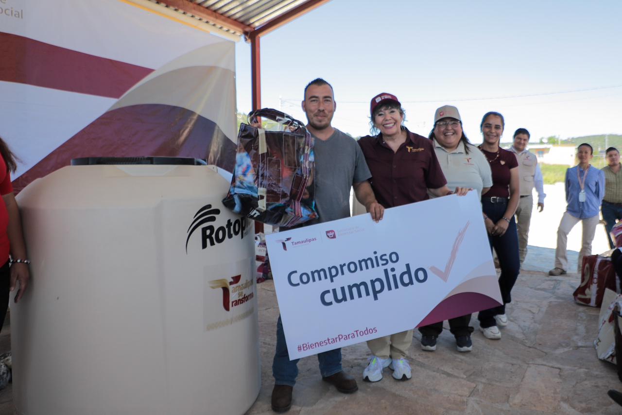 En cumplimiento con el compromiso del Gobierno de Tamaulipas, de llevar apoyos a las familias más vulnerables de la región, la secretaria de Bienestar Social, (SEBIEN) Silvia Casas González, en representación del gobernador Américo Villarreal Anaya, encabezó la entrega de 24 tinacos con una capacidad de mil 100 litros en el ejido General Lauro Villar, del municipio de San Nicolás.