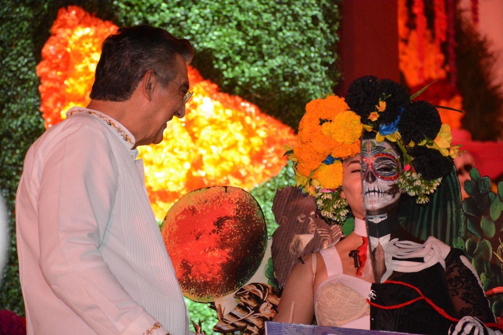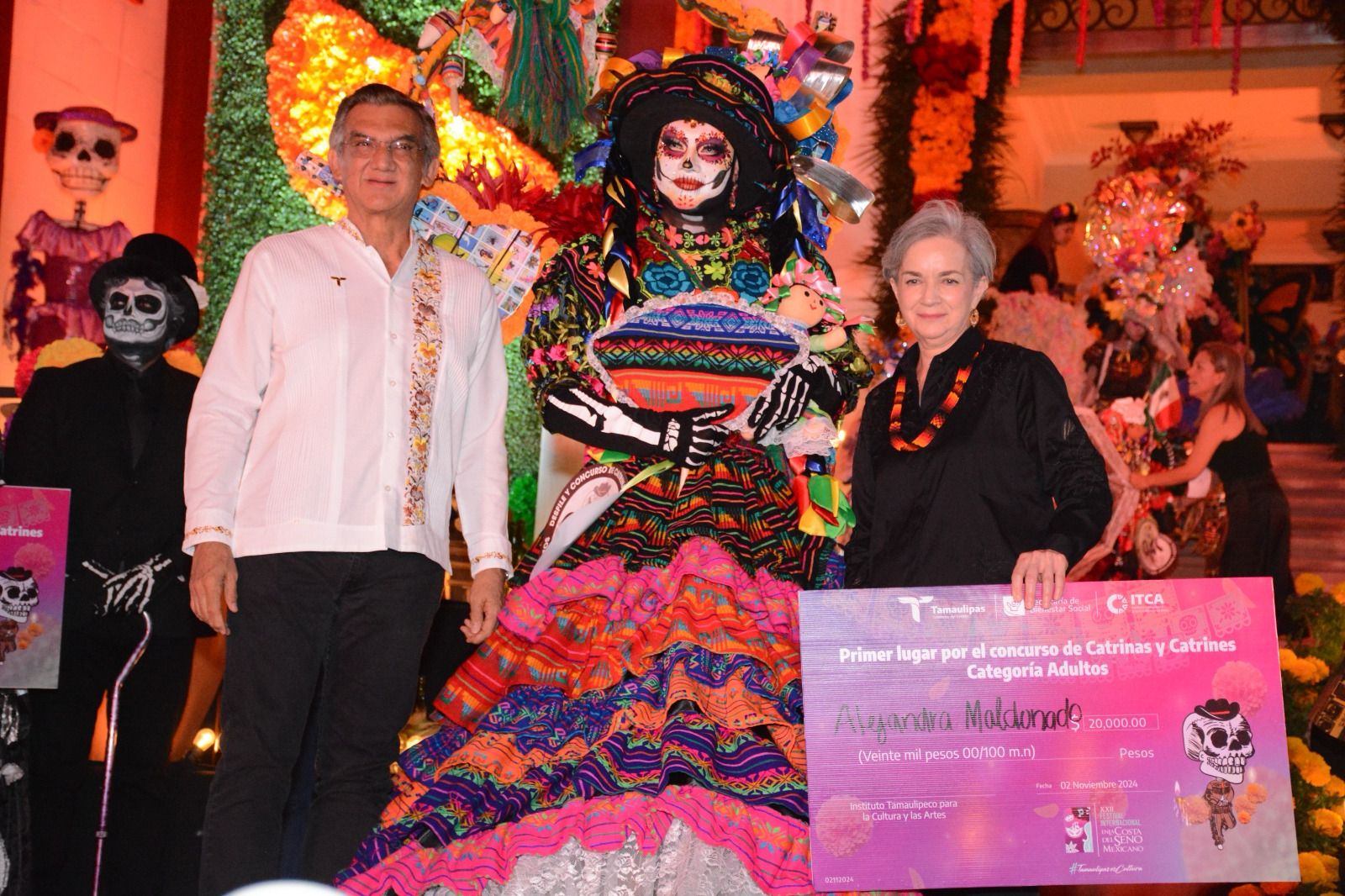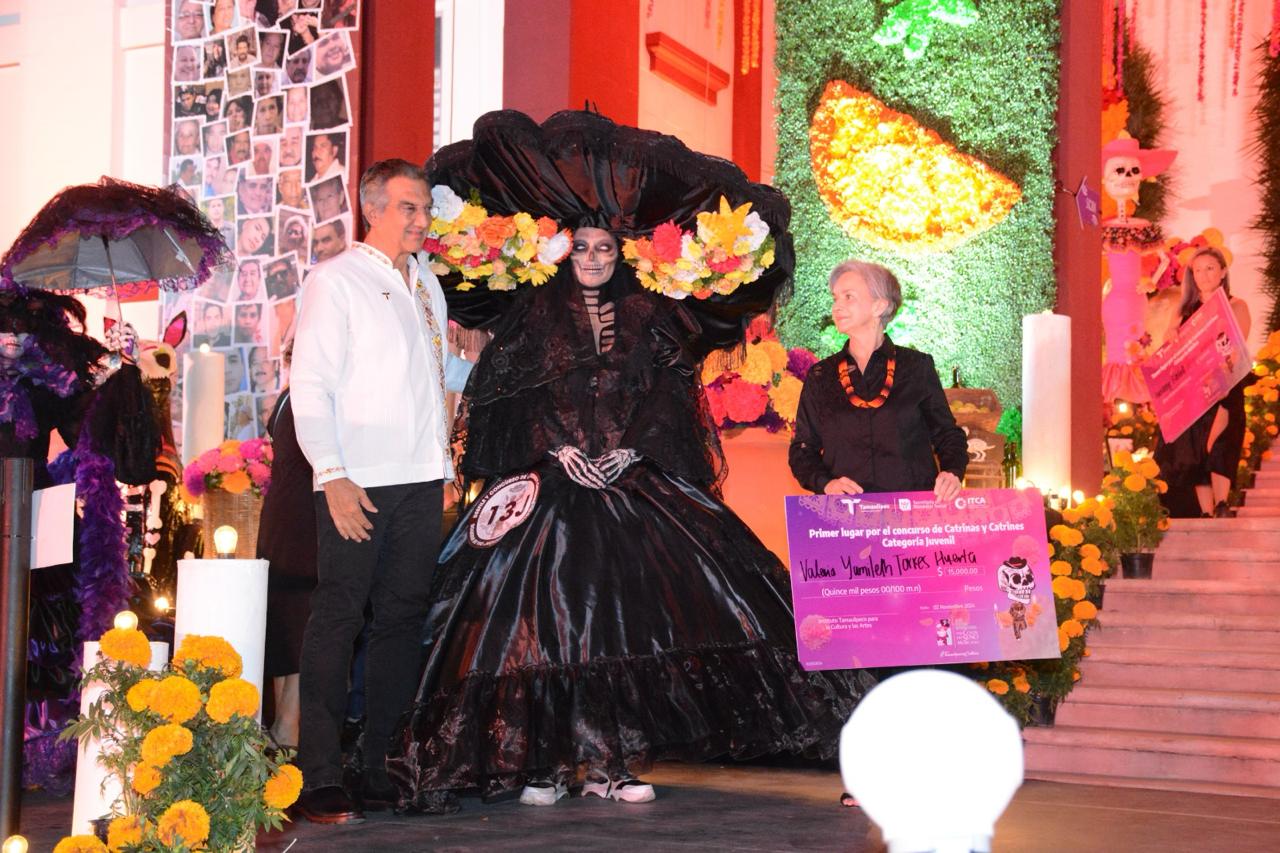 El gobernador Américo Villarreal Anaya y la presidenta del DIF Estatal, María de Villarreal, premiaron a las y los ganadores del concurso de “Catrinas y Catrines Tradición y Color” y recorrieron junto con las familias victorenses el altar monumental instalado en Palacio de Gobierno como parte de las festividades del Día de Muertos.
