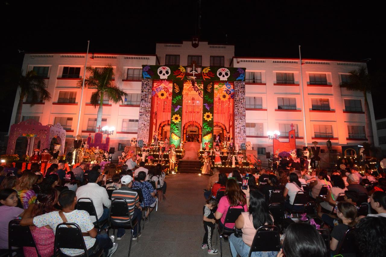 El altar instalado en el pórtico principal de Palacio de Gobierno fue elaborado nuevamente por artesanos tamaulipecos y cuenta con símbolos distintivos como la mariposa monarca, el colibrí, las naranjas y piñatas artesanales, además de estar adornado con flores de cempasúchil y gigantescas figuras alusivas a esta festividad.