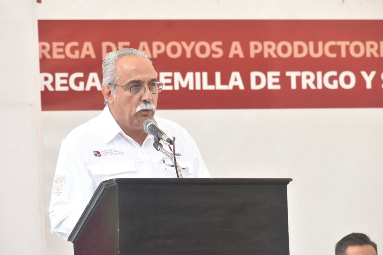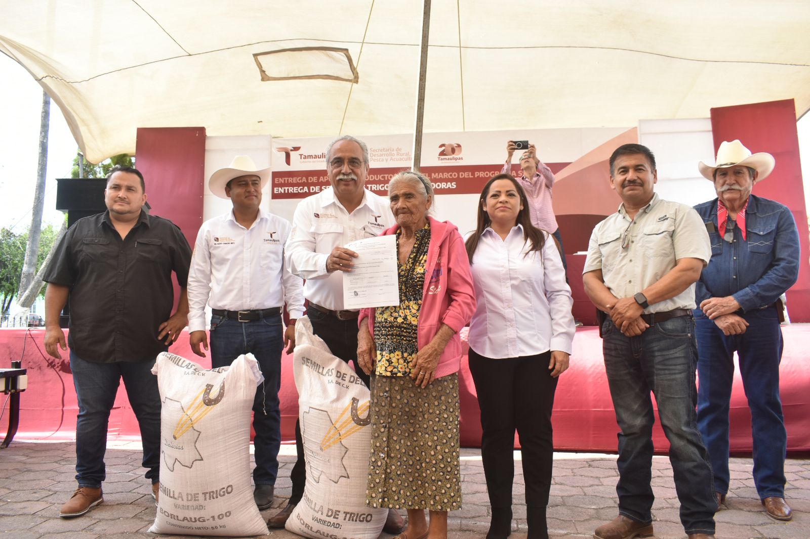 Por su parte, Eliseo Camacho Nieto, subsecretario de Desarrollo Agrícola refirió que «desde la administración del gobernador Américo Villarreal Anaya, hemos estado juntos en esta lucha y ante esta problemática, hoy estamos aquí con ustedes para hacer entrega de semilla de trigo y de sembradoras, decirles que con esta semilla iniciamos el plan piloto en la búsqueda de alternativas que suplan el plantío de sorgo, sabemos de la importancia de la región como lo es el grano rojo».