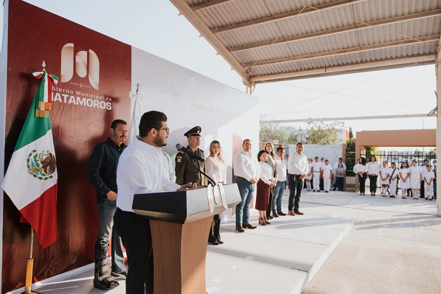 Este lunes 25 de noviembre, en el marco de la Ceremonia Cívica de Honores a la Bandera, el alcalde Beto Granados anunció la construcción de un aula en la primaria “José Doroteo Arango”, ubicada en el fraccionamiento Pueblitos, en Matamoros.