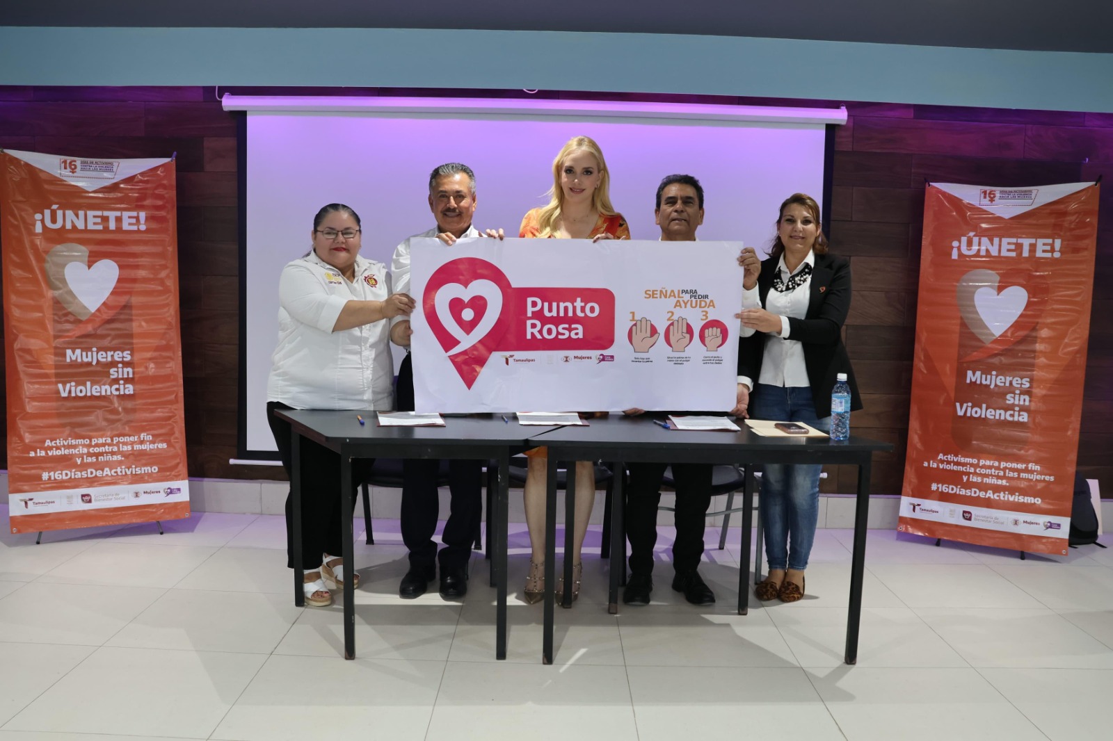 Además, se firmó el convenio “Punto Rosa” con el CBTis 135 y con transportistas del municipio, fortaleciendo espacios seguros tanto en el ámbito educativo como en el transporte público. En este contexto, también se implementó el programa Asiento Rosa, que designa un espacio exclusivo para mujeres en el transporte público.