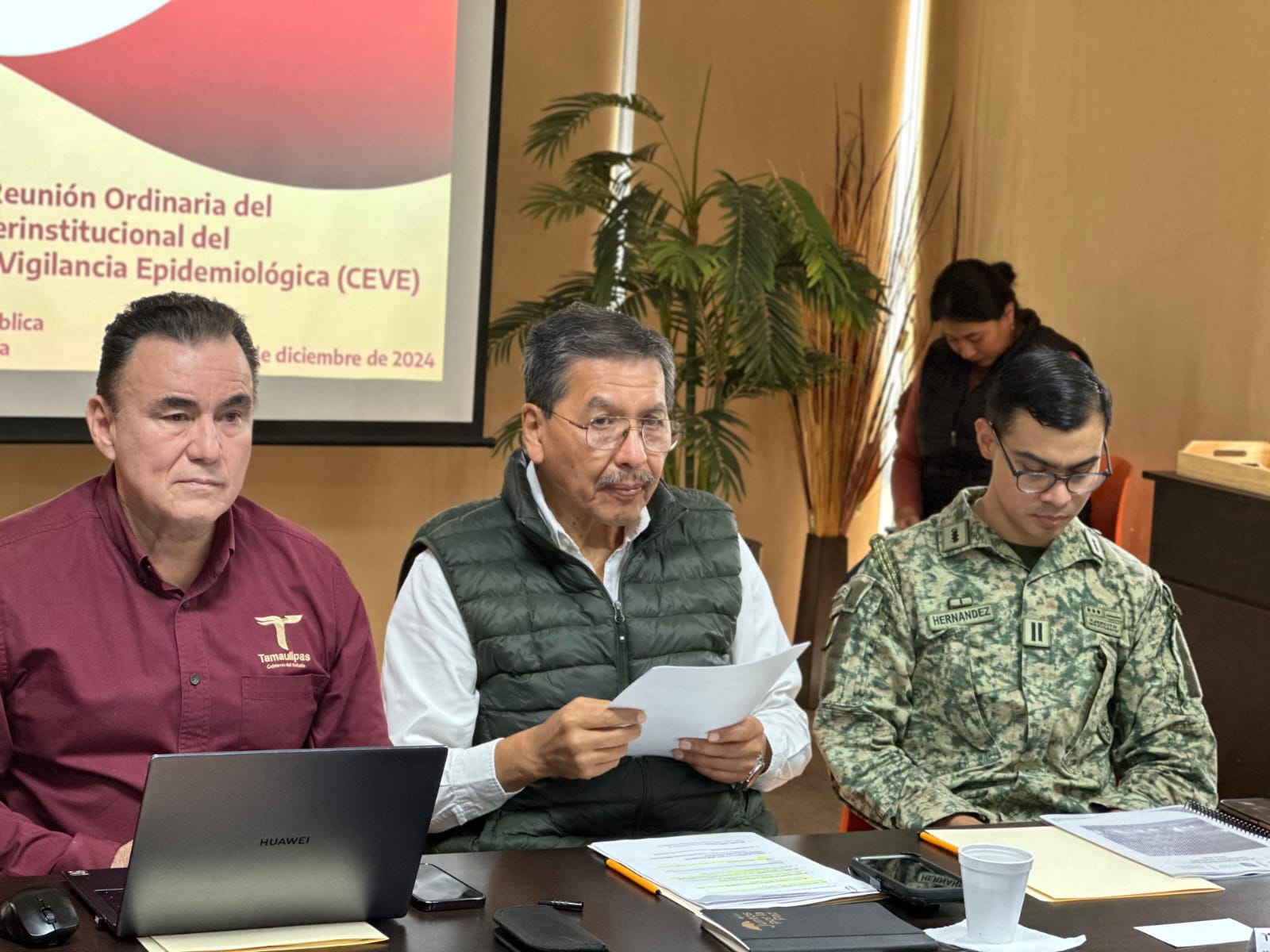 En la última sesión de este año, en representación del secretario de Salud, Vicente Joel Hernández Navarro, el subsecretario de Salud Pública, Rembrandt Reyes Nájera, convocó a los representantes del Sector Salud a fortalecer las estrategias y reforzar la vigilancia epidemiológica y sanitaria en las unidades hospitalarias para mantener el bienestar de las familias tamaulipecas.