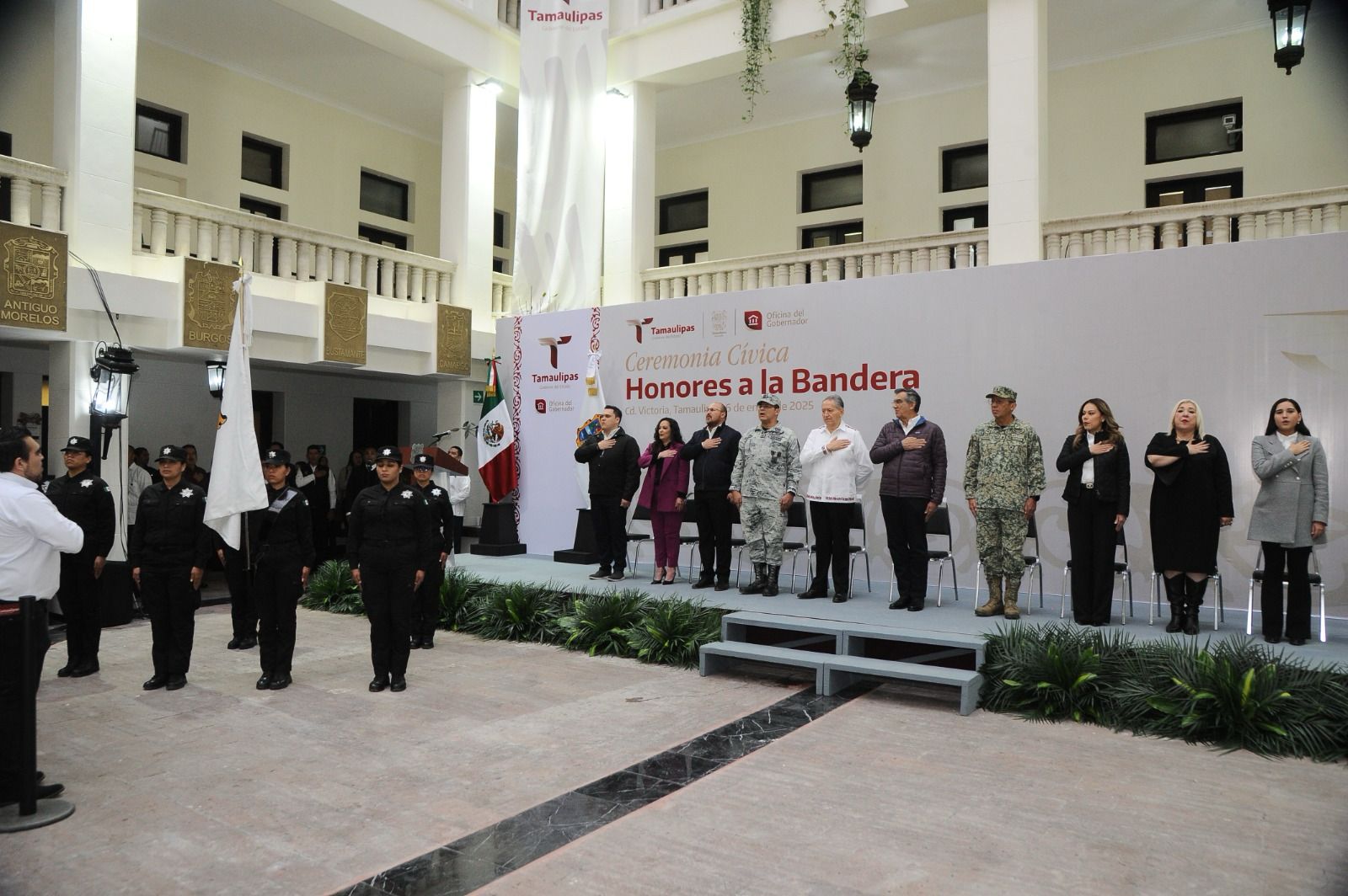 Al presidir la primera ceremonia cívica de honores de 2025, en la explanada central de Palacio de Gobierno, el mandatario tamaulipeco llamó a las y los servidores públicos a trabajar en una agenda humanista, con gran ahínco y dedicación, para seguir transformando a Tamaulipas.