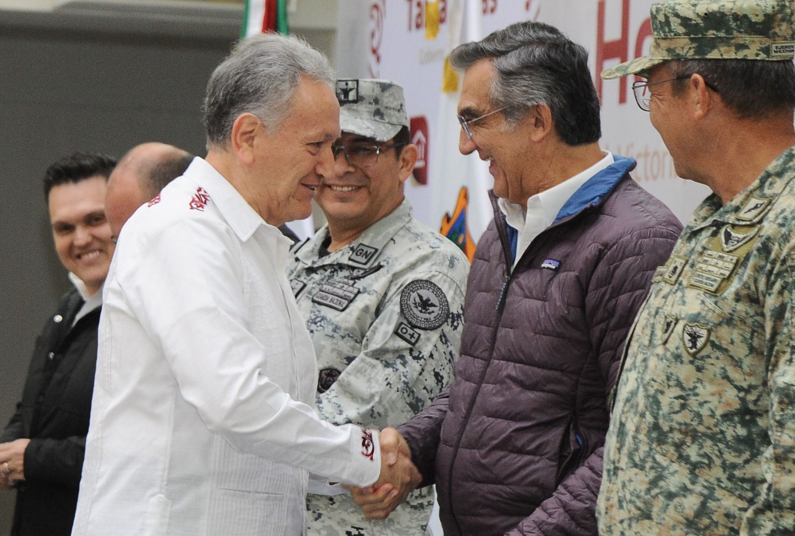 En esta ceremonia, el gobernador estuvo acompañado por Tania Contreras López, consejera jurídica; Olga Sosa Ruiz, senadora por Tamaulipas; Héctor Joel Villegas González, secretario general de Gobierno; diputado Humberto Prieto Herrera, presidente de la Junta de Coordinación Política del Congreso del Estado; diputada Katalyna Méndez Cepeda, presidenta de la diputación permanente del Congreso; Adriana Lozano Rodríguez, secretaria de Finanzas; magistrado Hernán De la Garza Tamez, presidente del Supremo Tribunal de Justicia; Francisco Alvarado Terán, coordinador estatal de la Guardia Nacional; y el comandante de la 48 Zona Militar, general DEM, Enrique García Jaramillo.