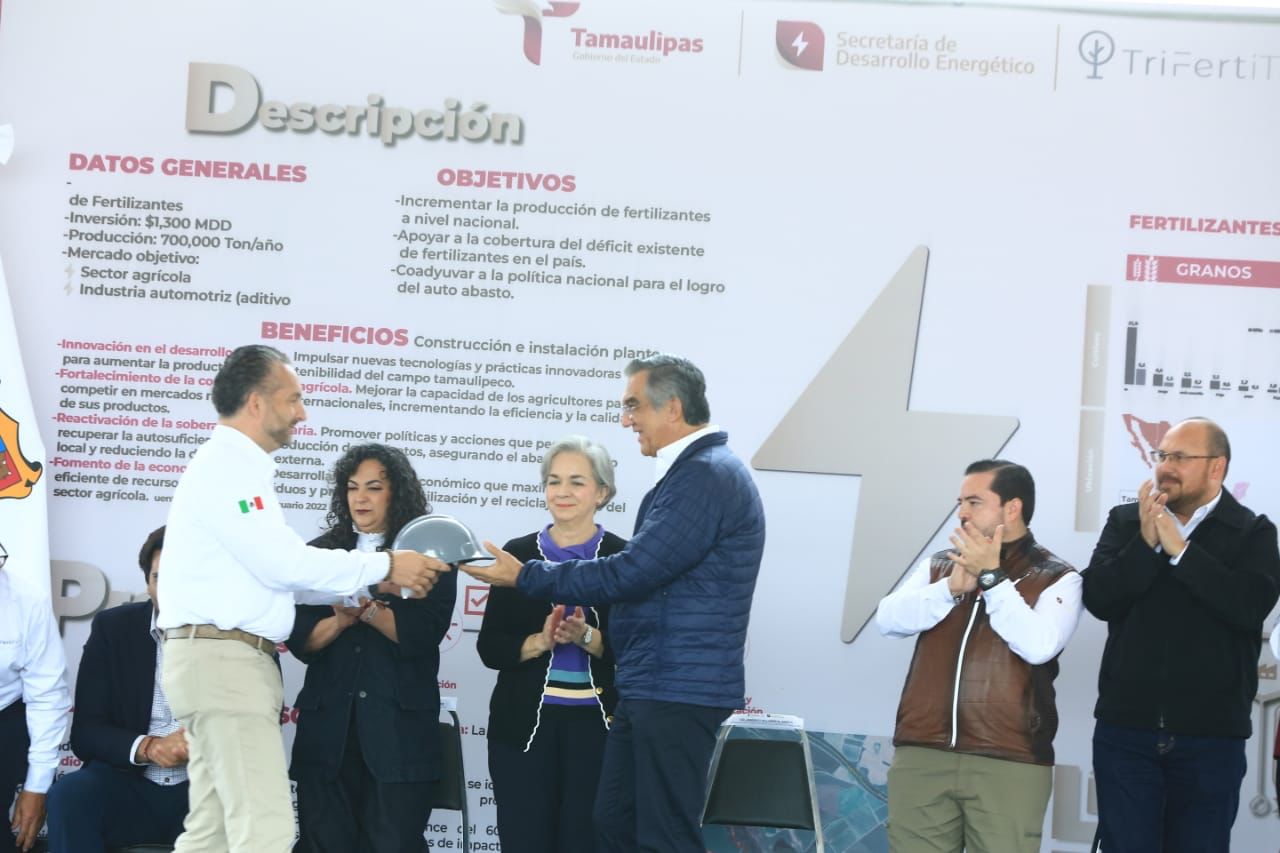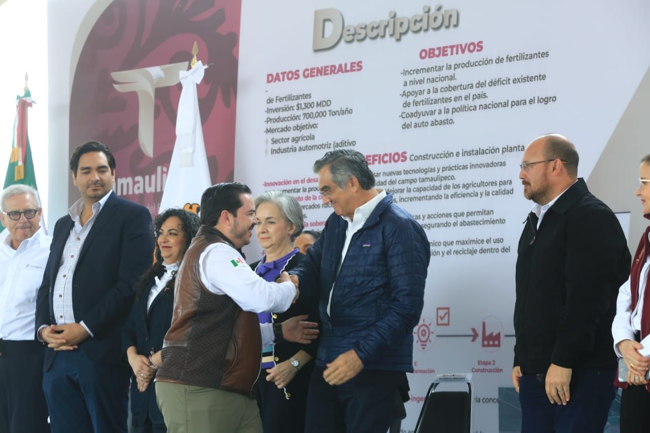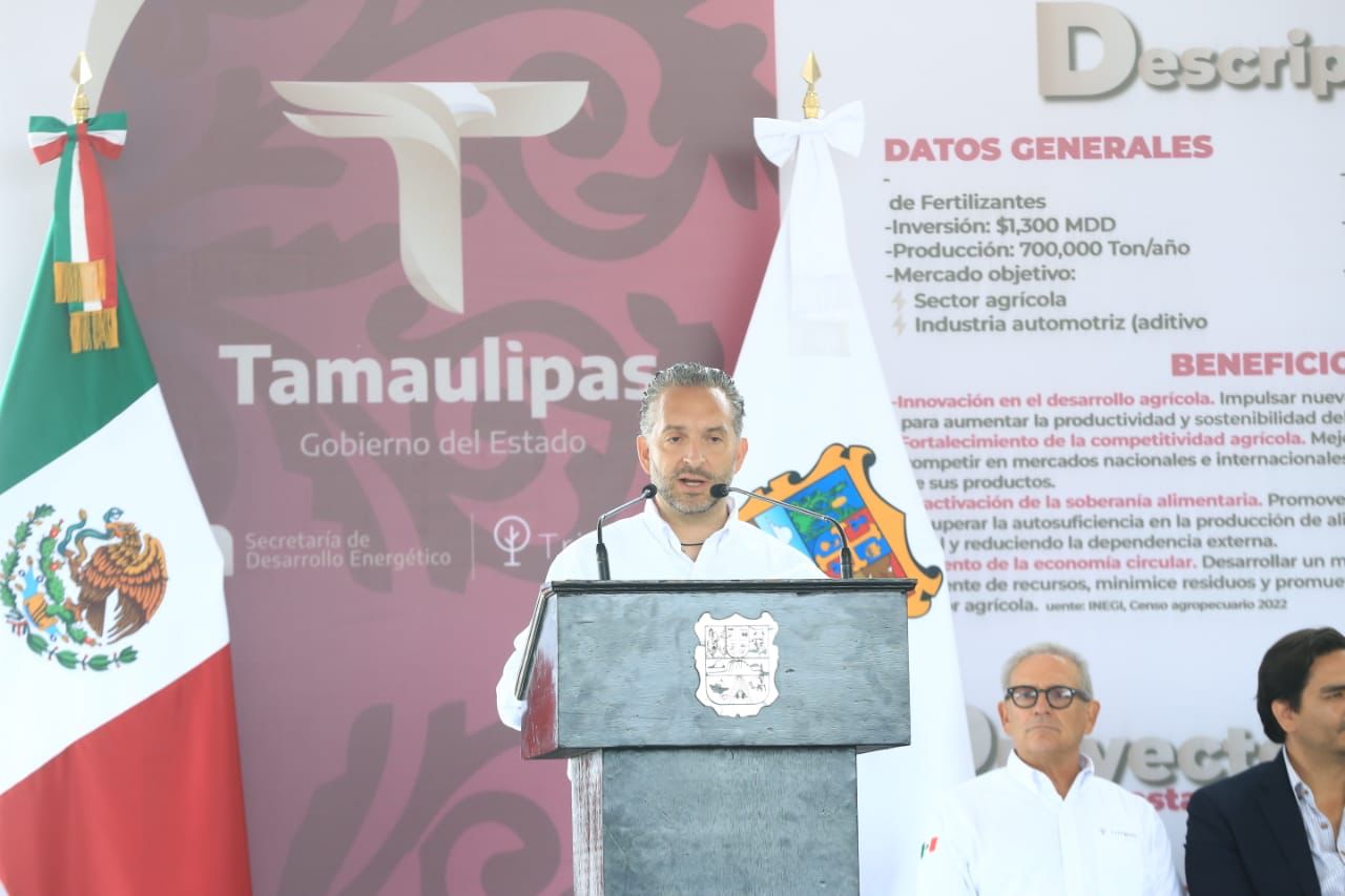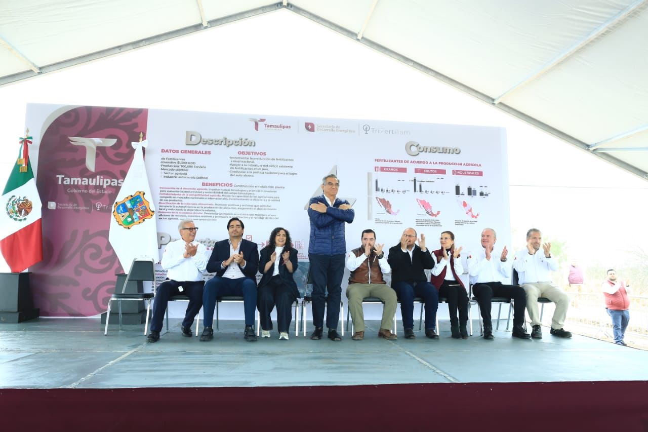 Con una inversión histórica de mil 300 millones de dólares y con el objetivo de coadyuvar a incrementar la producción en el campo mexicano, el gobernador Américo Villarreal Anaya presidió el arranque de obra de la planta de fertilizantes, que tendrá una producción de 700 mil toneladas anuales y generará mil 500 empleos directos durante su construcción.