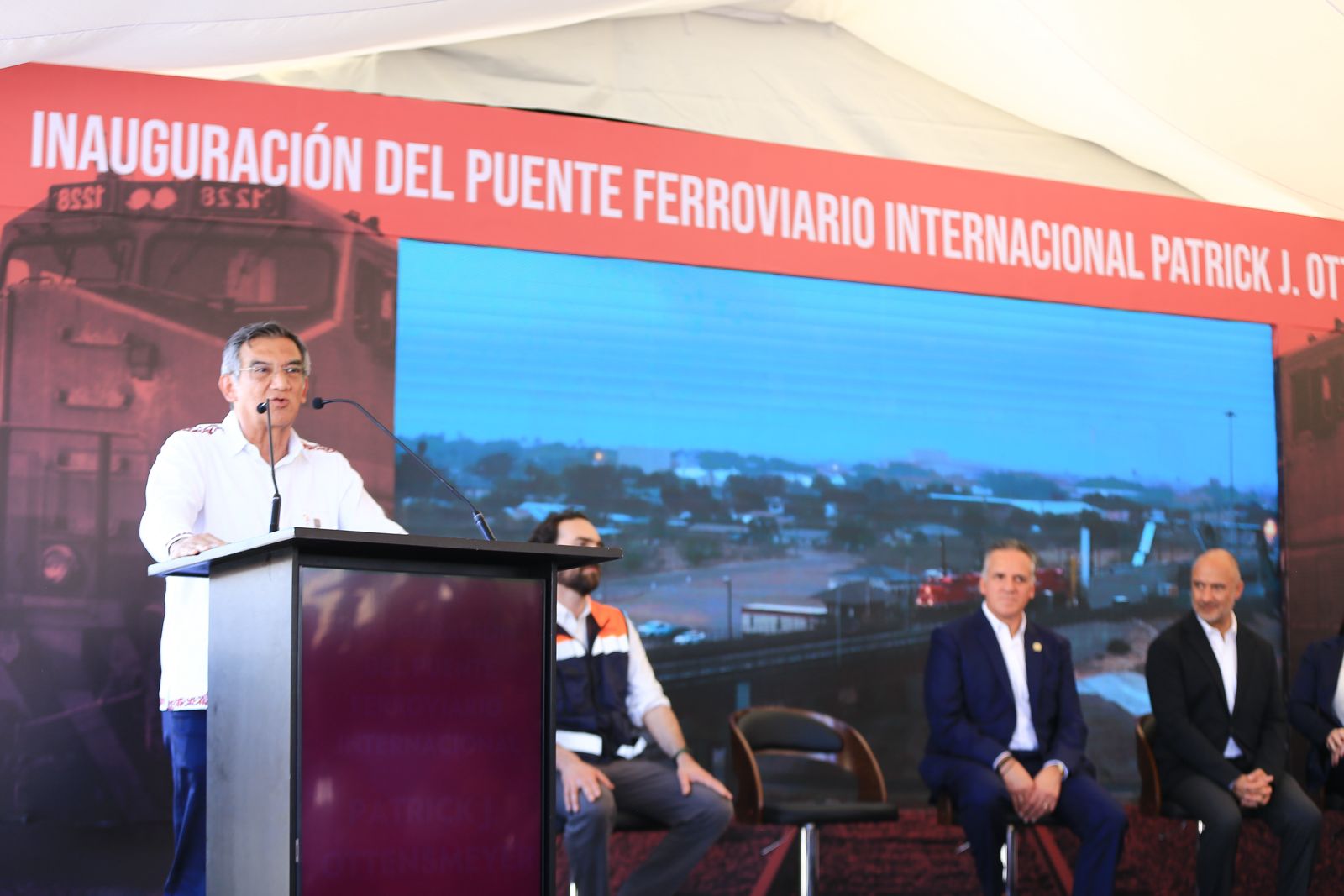 El gobernador Américo Villarreal Anaya y el secretario de Infraestructura, Comunicaciones y Transportes, Jesús Antonio Esteva Medina, junto con directivos de la empresa Canadian Pacific Kansas City, inauguraron en esta ciudad el puente ferroviario internacional Patrick J. Ottensmeyer, que permitirá duplicar el intercambio comercial entre el corazón industrial de México con Estados Unidos y Canadá.