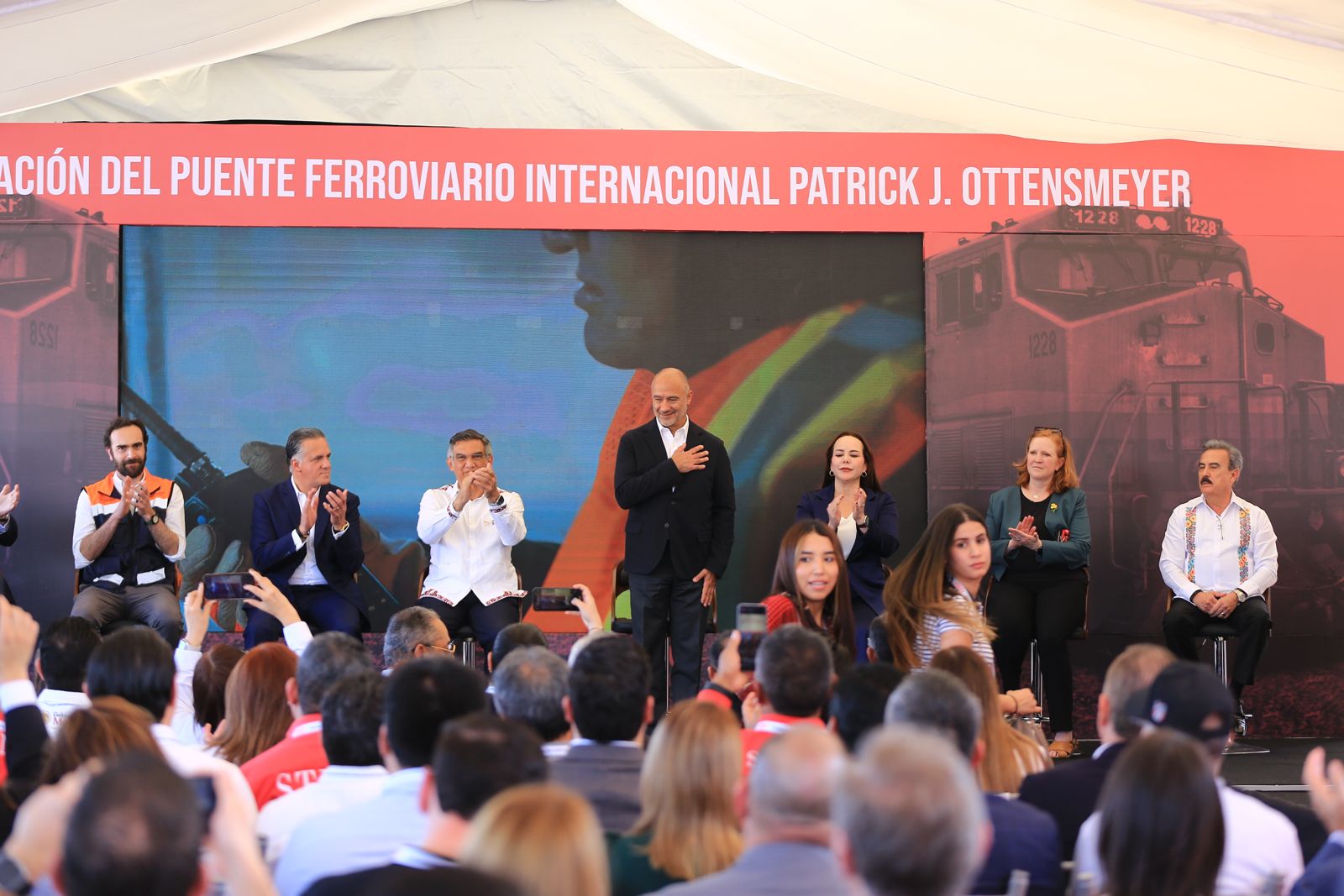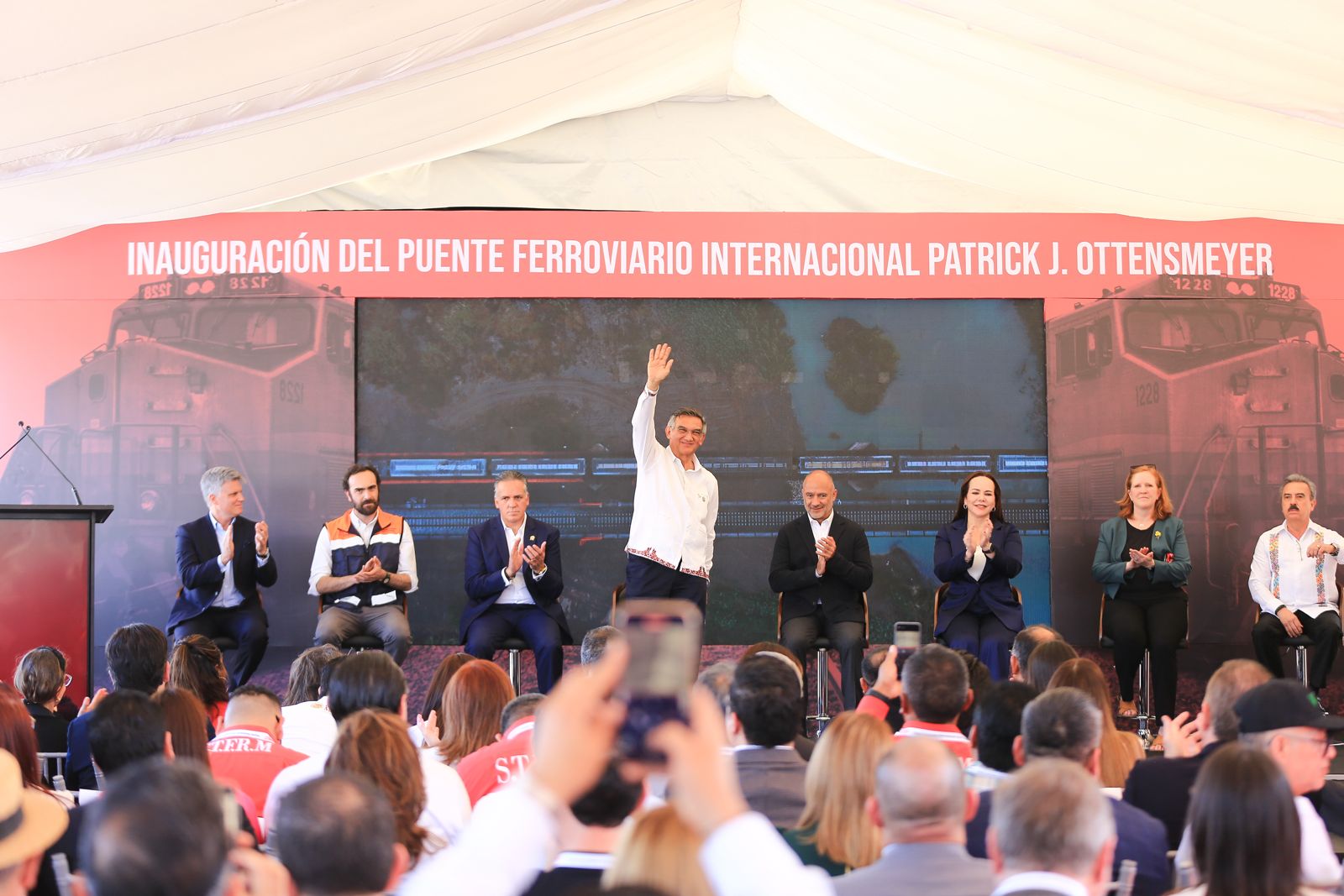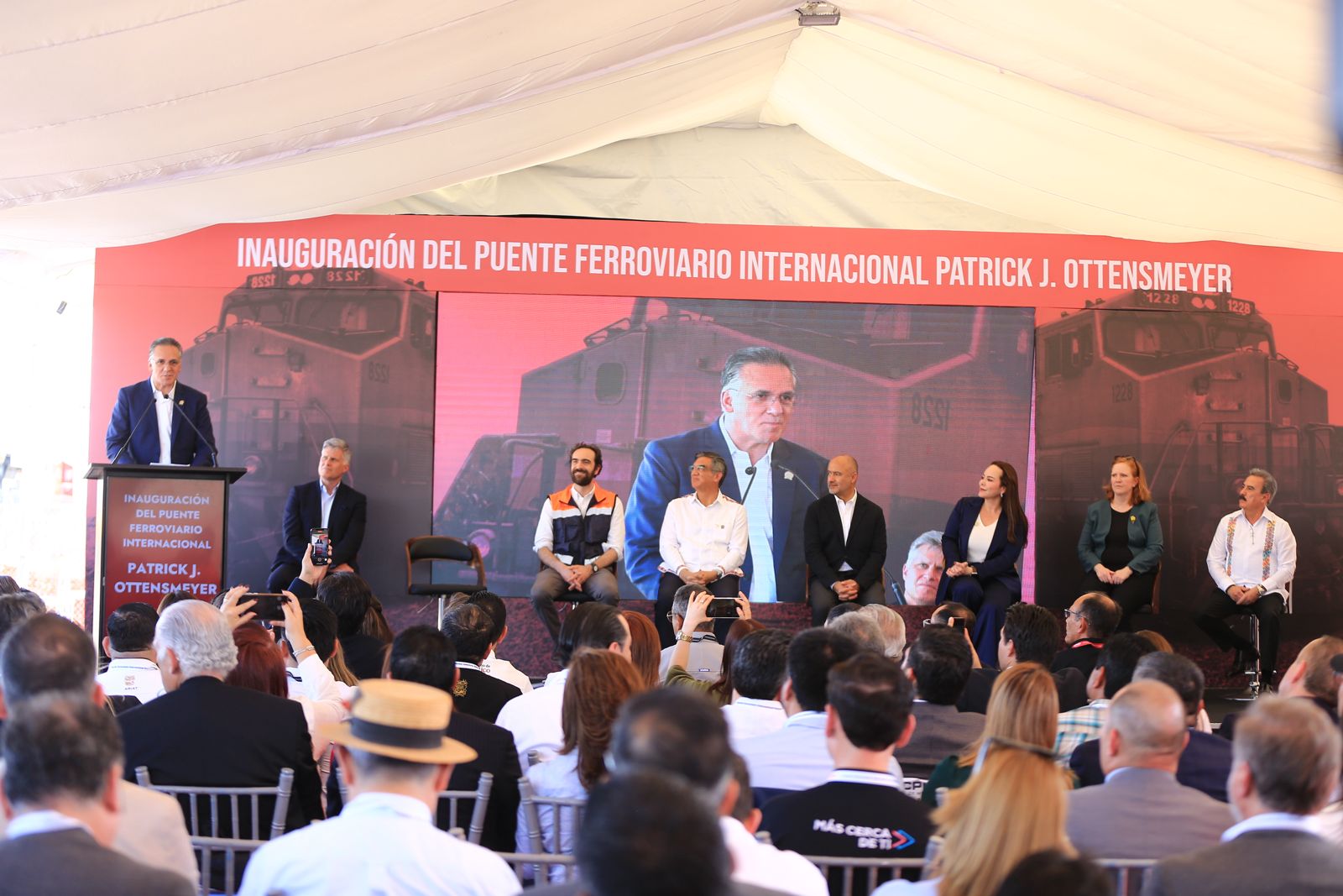 El gobernador Américo Villarreal Anaya y el secretario de Infraestructura, Comunicaciones y Transportes, Jesús Antonio Esteva Medina, junto con directivos de la empresa Canadian Pacific Kansas City, inauguraron en esta ciudad el puente ferroviario internacional Patrick J. Ottensmeyer, que permitirá duplicar el intercambio comercial entre el corazón industrial de México con Estados Unidos y Canadá.