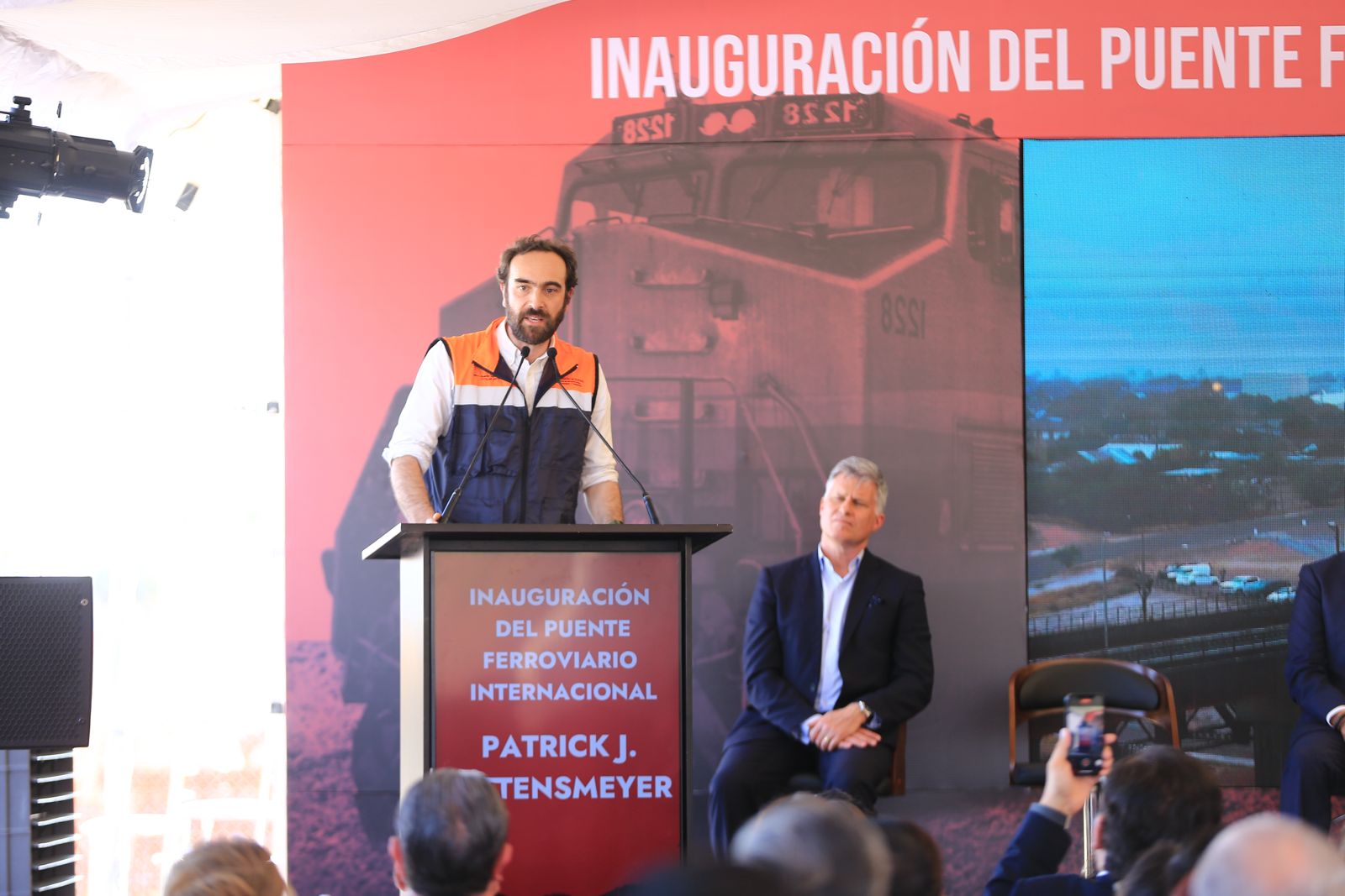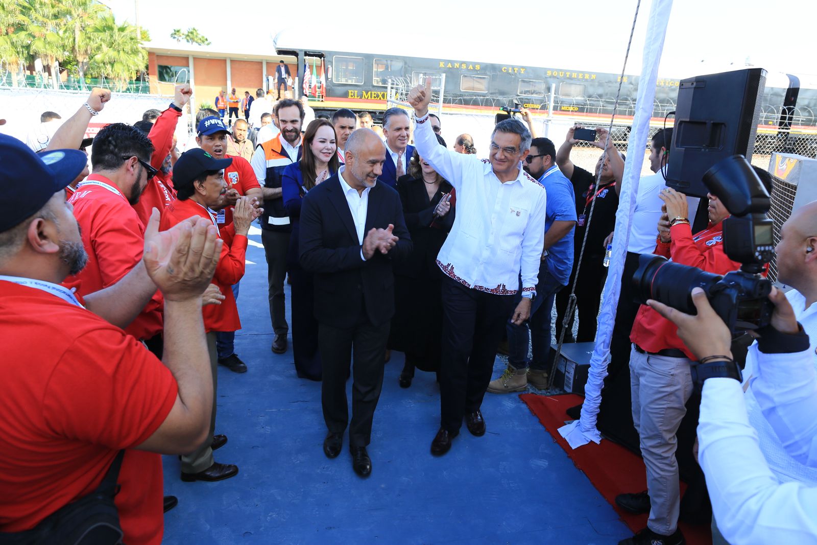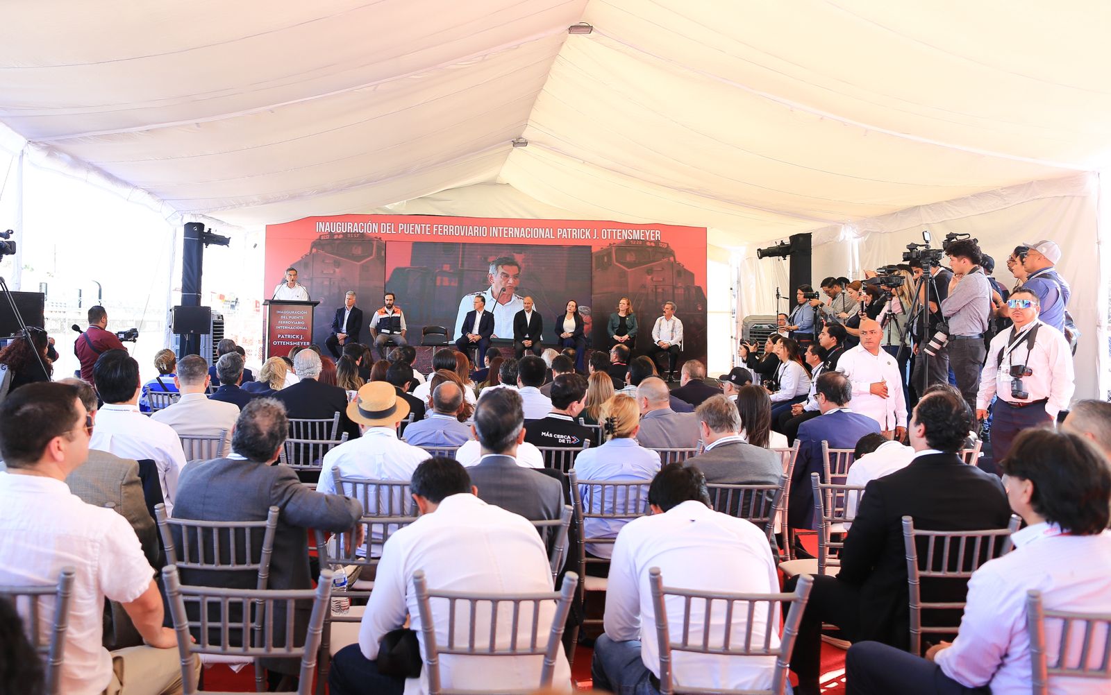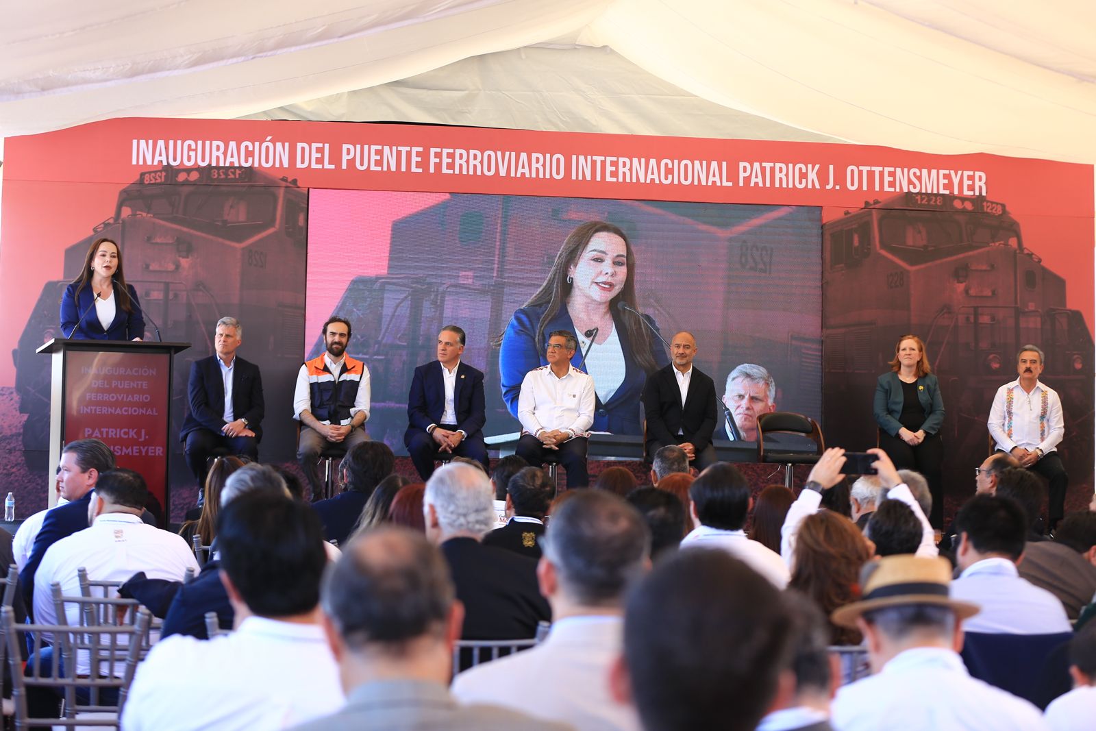 El gobernador Américo Villarreal Anaya y el secretario de Infraestructura, Comunicaciones y Transportes, Jesús Antonio Esteva Medina, junto con directivos de la empresa Canadian Pacific Kansas City, inauguraron en esta ciudad el puente ferroviario internacional Patrick J. Ottensmeyer, que permitirá duplicar el intercambio comercial entre el corazón industrial de México con Estados Unidos y Canadá.