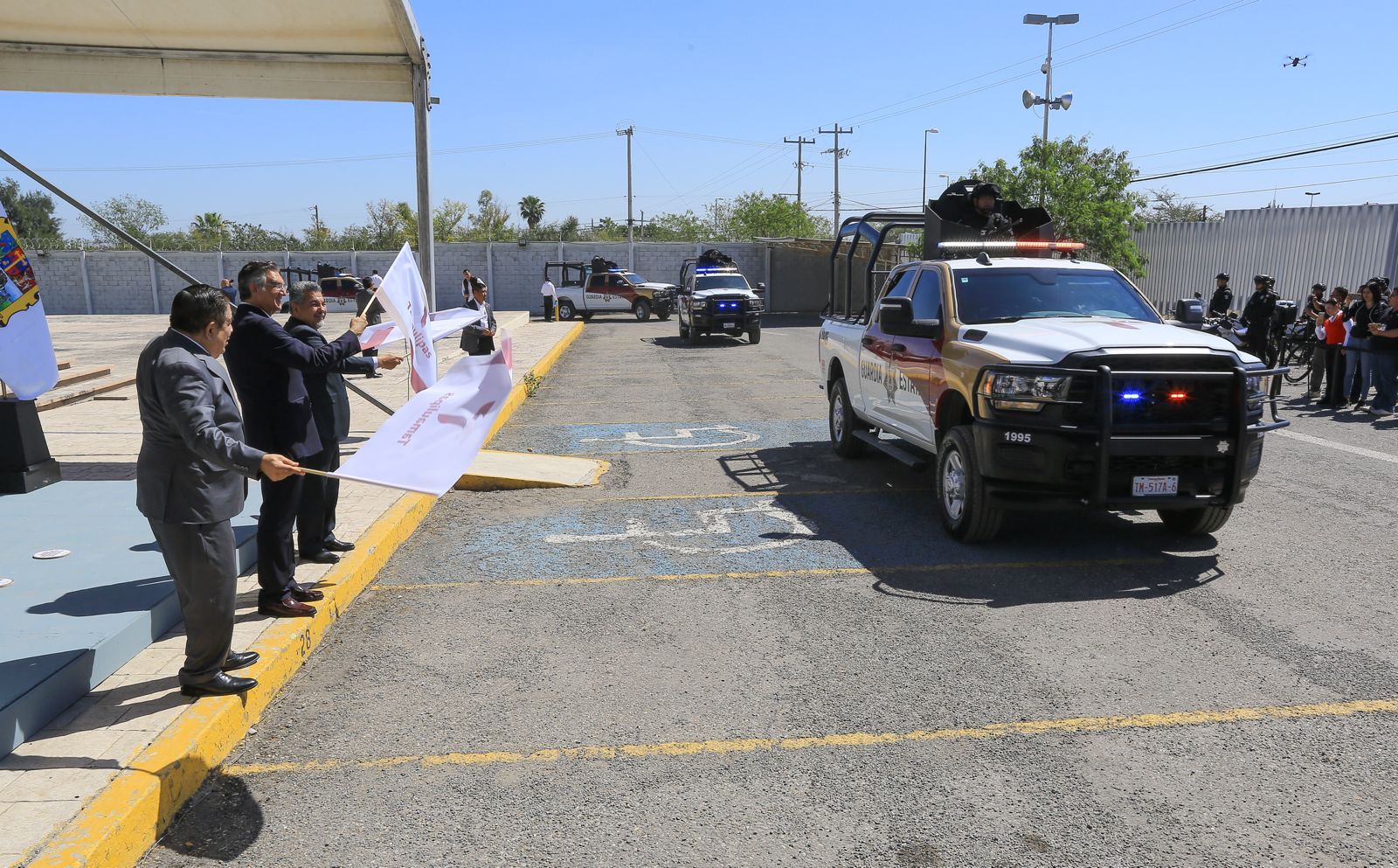 Acompañado por el secretario de Seguridad Pública, Sergio Chávez García, y por el secretario ejecutivo del Sistema Estatal de Seguridad Pública, Jorge Cuéllar Montoya, el mandatario estatal dio el banderazo de salida a las nuevas unidades que, a partir de este día, se suman a las tareas de vigilancia, principalmente en la zona fronteriza del estado.