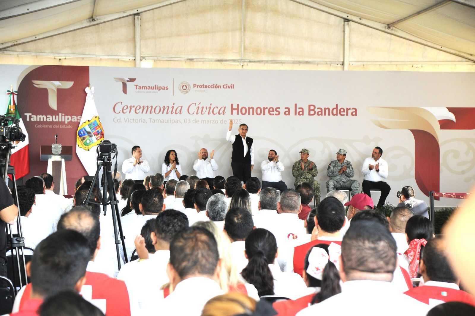 Al presidir la ceremonia cívica de honores este lunes en las instalaciones de Protección Civil, el gobernador reconoció la labor y el desempeño de todo el personal de esta dependencia para enfrentar las contingencias y los riesgos de distinta índole y origen, que pueden afectar la estabilidad de una entidad como Tamaulipas donde existe una propensión alta y diversa por su atlas de riesgo.