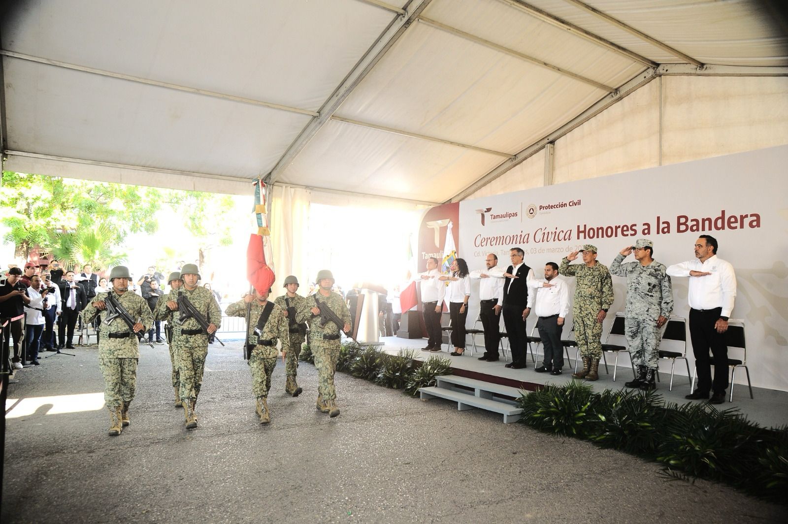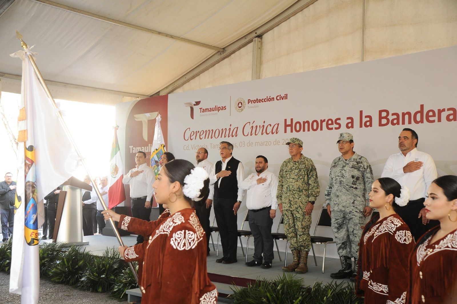 Acompañaron al gobernador en este evento: Héctor Joel Villegas González, secretario general de Gobierno; general DEM Enrique García Jaramillo, comandante de la 48a. Zona Militar; comisario Francisco Alvarado Terán, coordinador Estatal de la Guardia Nacional en Tamaulipas; diputado Humberto Prieto Herrera, presidente de la Junta de Coordinación Política del Congreso del Estado; diputada Cynthia Jaime Castillo, presidenta de la Mesa Directiva del Congreso local y magistrado Hernán De la Garza Tamez, presidente del Supremo Tribunal de Justicia, además de personal de Protección Civil, del Centro Regional de Urgencias Médicas y de la delegación estatal de la Cruz Roja.