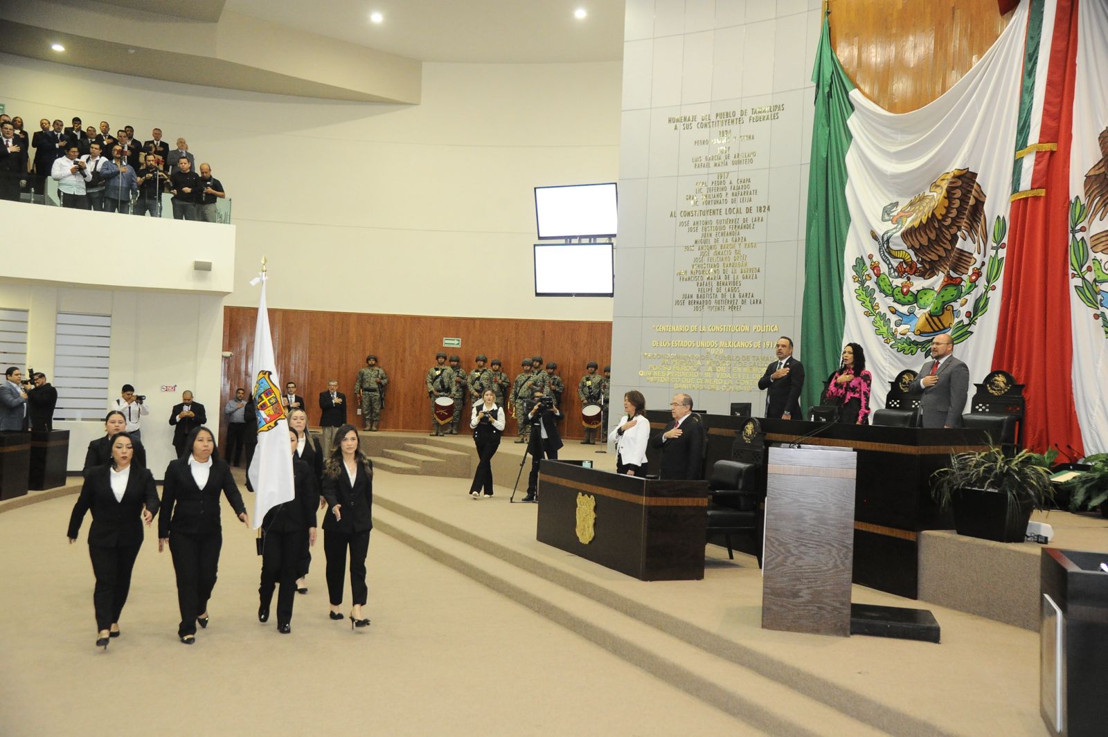 En sesión pública y solemne de la Legislatura 66, celebrada la mañana de este sábado, el secretario general de Gobierno dio cumplimiento a lo dispuesto en el artículo 44, párrafo segundo, de la Constitución Política de Tamaulipas y entregó a la diputada Cynthia Lizabeth Jaime Castillo, presidenta de la Mesa Directiva, el documento que puntualiza un informe pormenorizado con las políticas públicas y marcos estratégicos establecidos en el Plan Estatal de Desarrollo 2023-2028, en el periodo comprendido entre marzo de 2024 y febrero del presente año.