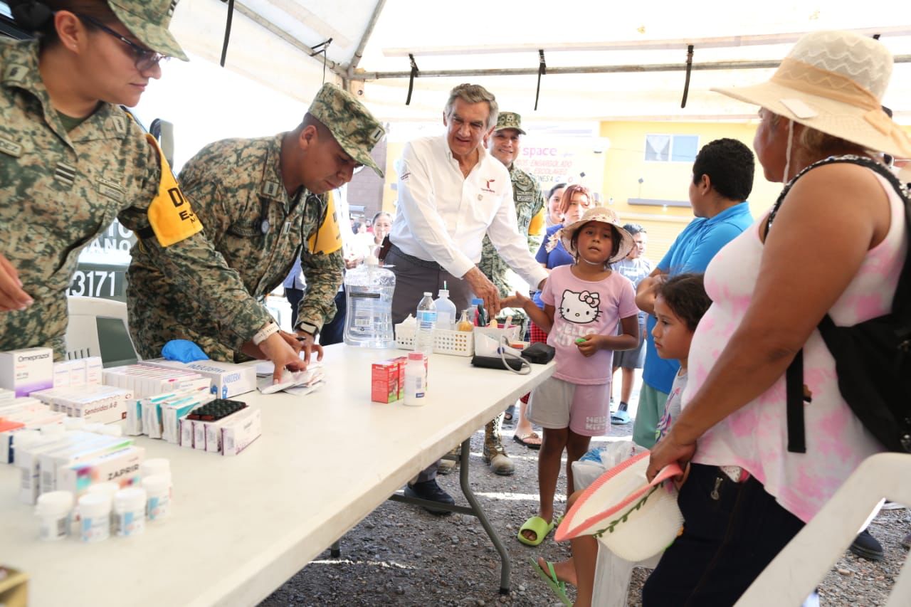 Durante su recorrido, el gobernador saludó a los elementos de la Secretaría de la Defensa que atienden la cocina comunitaria y el dispensario médico en la colonia Ernesto Zedillo, y además fue a la casa del señor Marcelo Martínez, a quien le ofreció todo su apoyo para atender los problemas de salud que lo aquejan.
