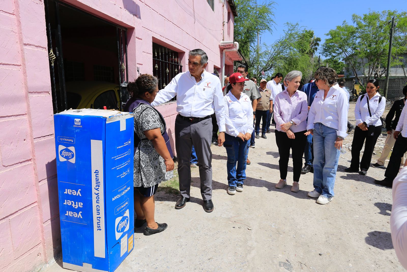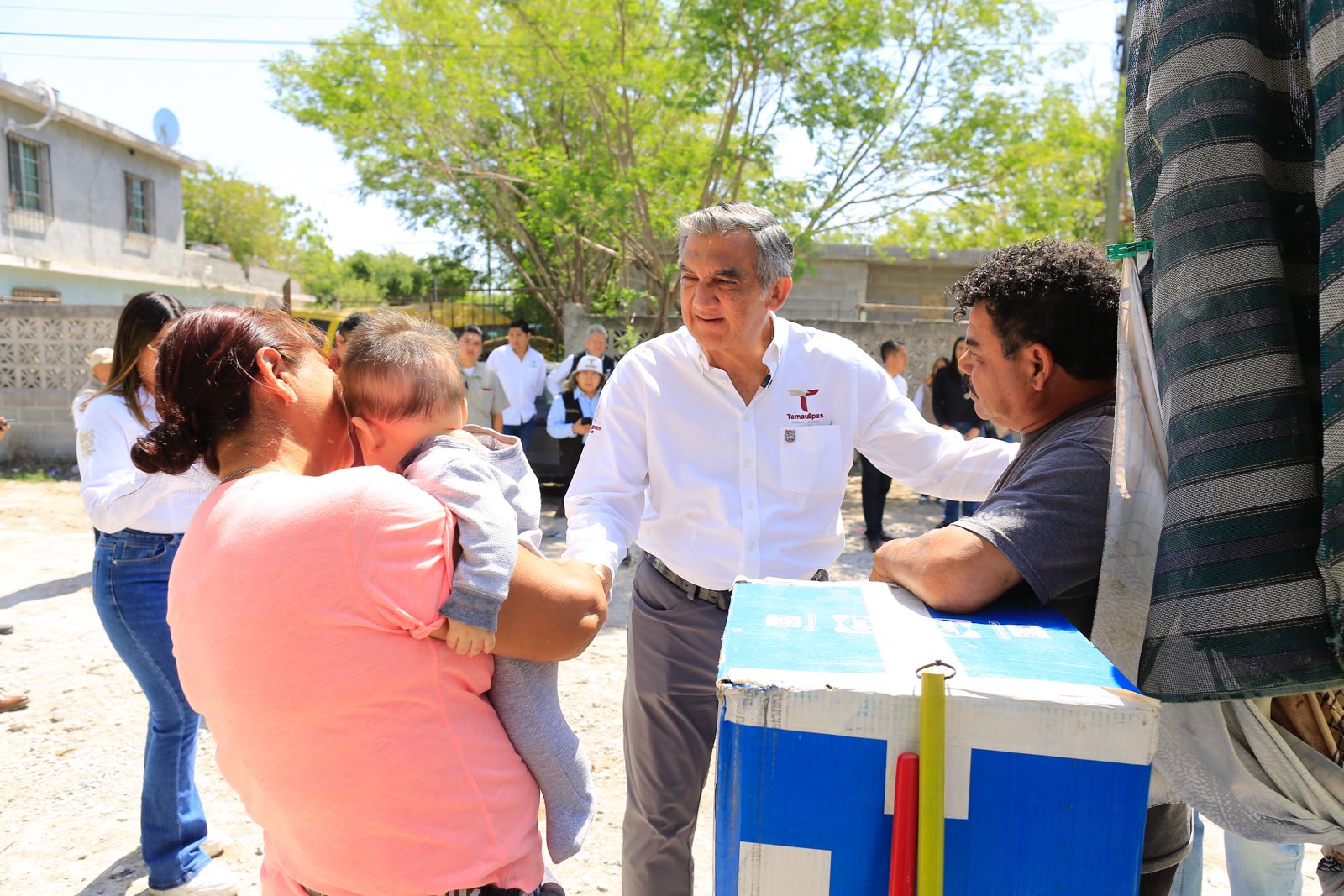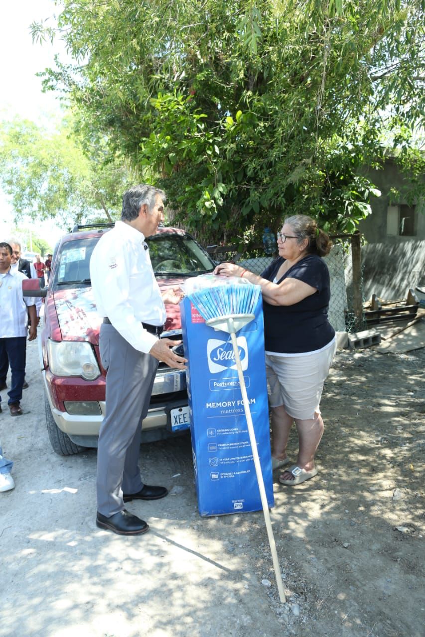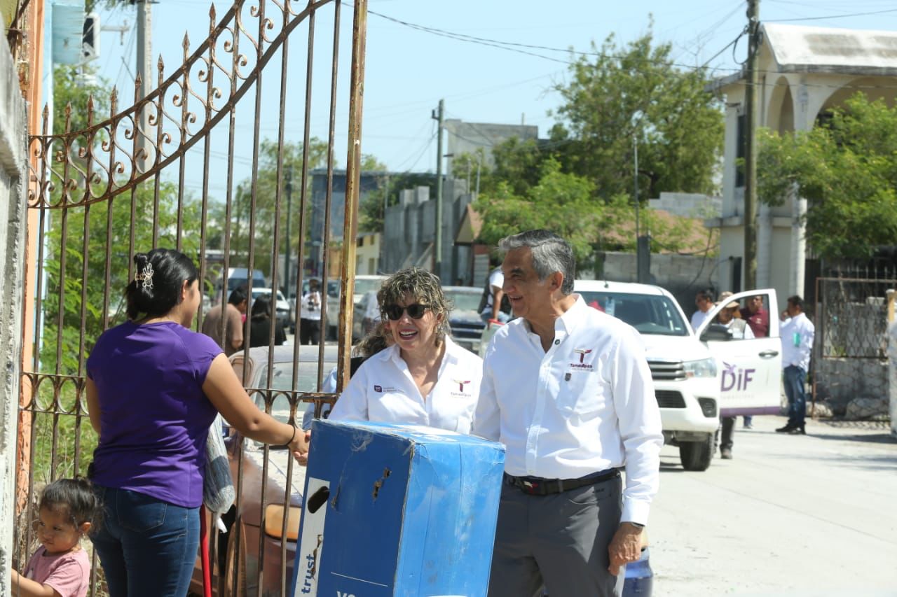 El gobernador Américo Villarreal Anaya y la presidenta del DIF Estatal, doctora María de Villarreal, encabezaron este sábado una jornada más de entrega de apoyos a familias que fueron afectadas por las lluvias en la colonia Juan Escutia, de Reynosa.