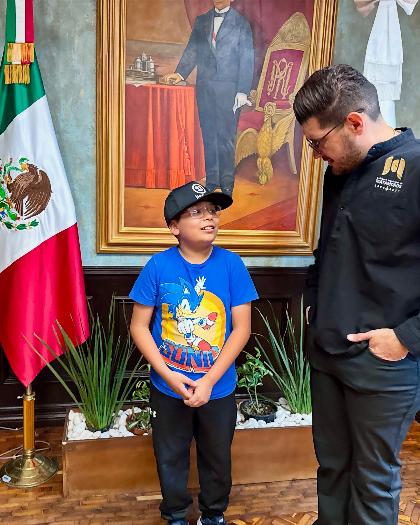 El Alcalde Beto Granados recibió en su oficina a Dylan Gael Orta Nodal, un niño matamorense que sueña con ser alcalde cuando sea grande. Acompañado por su abuelo, Dylan tuvo la oportunidad de conocer la sala Benito Juárez y el despacho del presidente municipal.