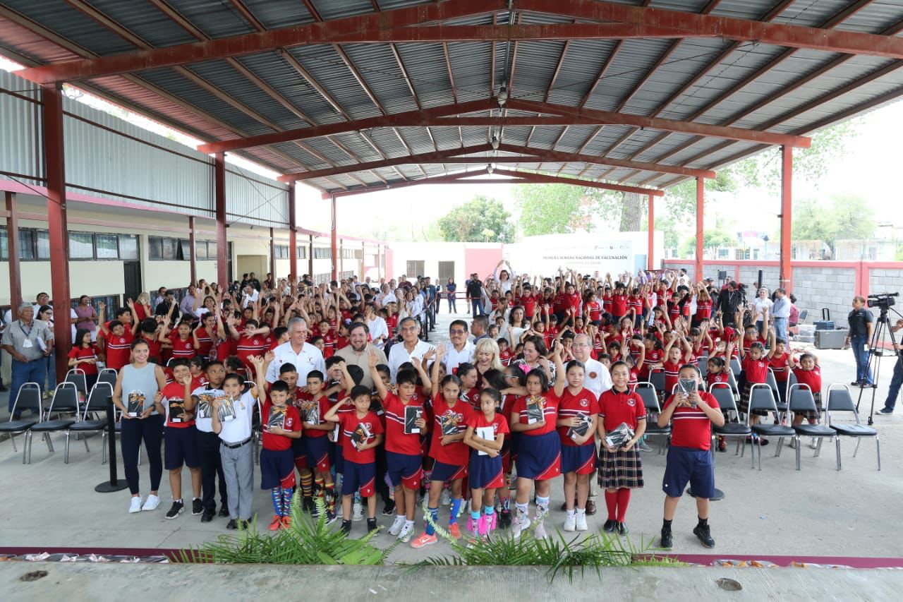Al poner en marcha la primera Semana Nacional de Vacunación en escuelas de educación básica y tras cumplir un compromiso que hizo hace pocas semanas de entregar dispositivos informáticos móviles a estudiantes de la escuela primaria “Felipe Pescador”, el gobernador Américo Villarreal Anaya aseguró que las niñas y los niños son la felicidad presente de Tamaulipas y la felicidad de una nueva sociedad que busca un futuro de bienestar con una visión humanista.