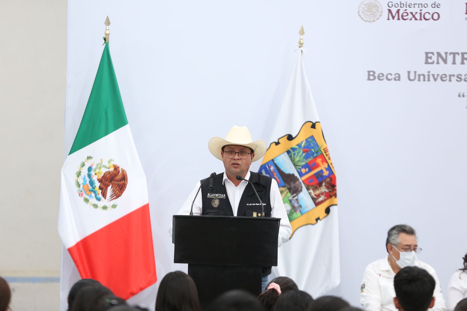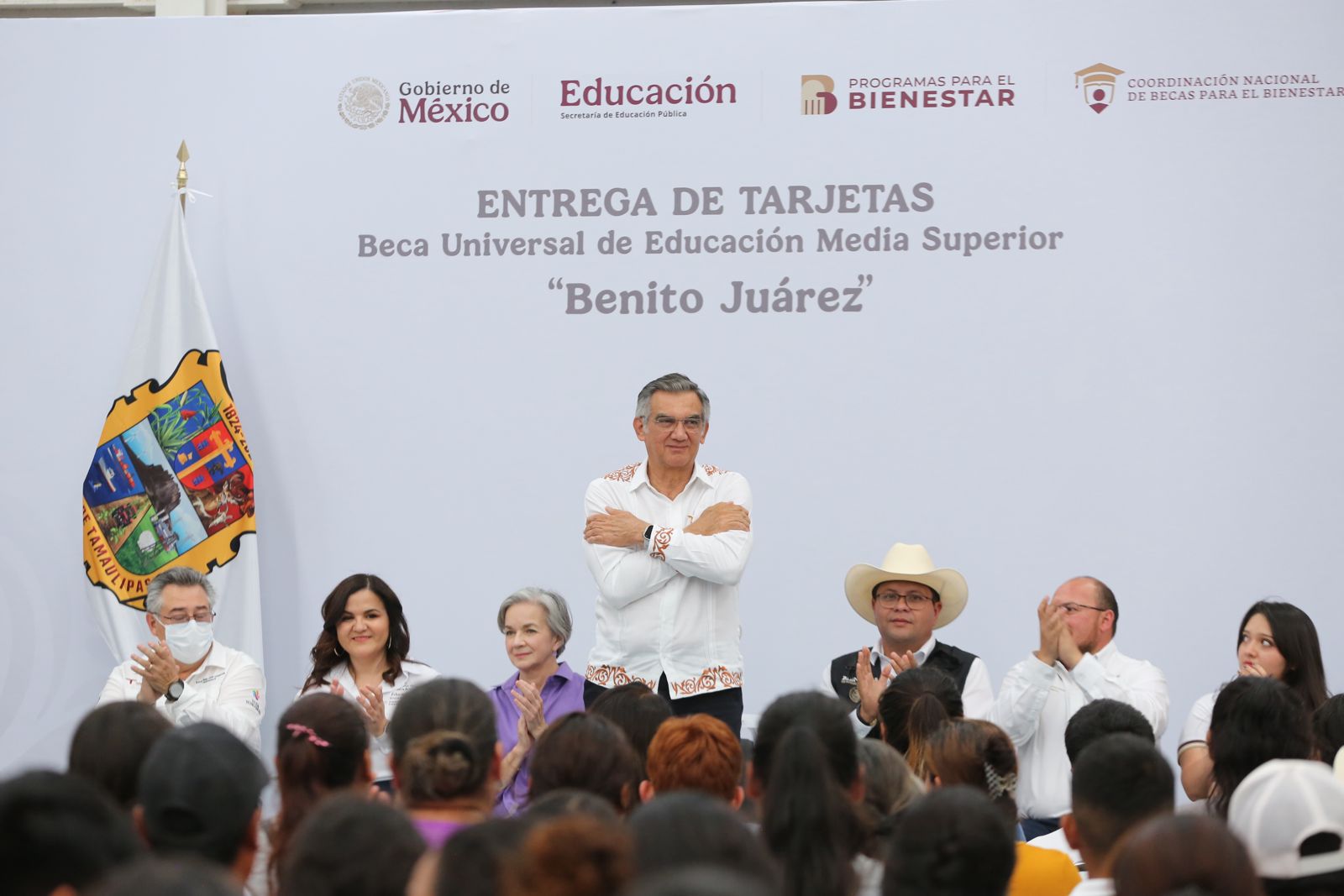 Al acompañar al delegado de Bienestar Federal, Luis Lauro Reyes Rodríguez, a la ceremonia de entrega de tarjetas de la Beca Universal de Educación Media Superior «Benito Juárez» a más de 300 alumnos de este municipio, y junto con la doctora María de Villarreal, presidenta del DIF Estatal, el gobernador destacó que gracias al apoyo de la presidenta Claudia Sheinbaum, Tamaulipas recibe más de 20 mil millones de pesos a través de los programas sociales.