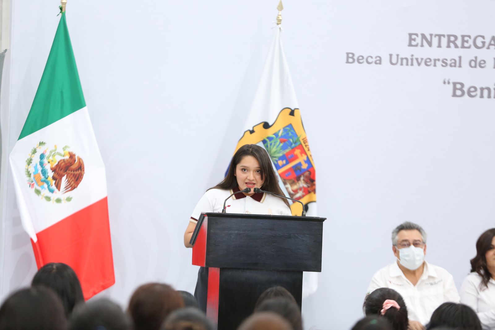 A nombre de sus compañeros, la alumna Mabel Victoria Vázquez Coronado expresó su agradecimiento a la presidenta Claudia Sheinbaum y al gobernador Américo Villarreal, ya que las becas Benito Juárez, dijo, han permitido que muchos estudiantes puedan continuar con sus estudios, aliviar cargas familiares y mantener viva la ilusión de convertirse en profesionistas.